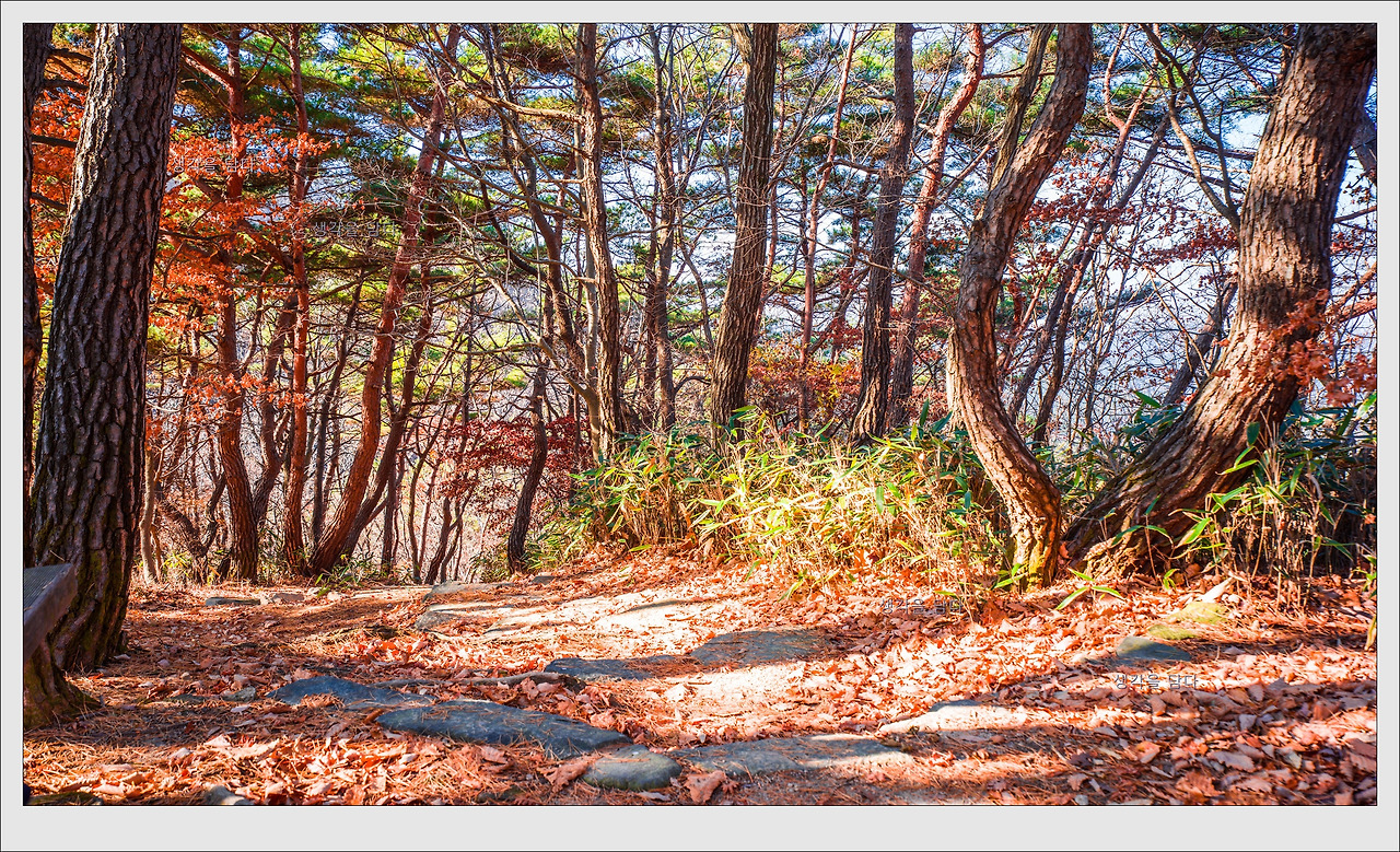 이맘때는 그동안 화려한 단풍에 밀려서 존재감이 없던 소나무의 푸른색이 드디어 돋보이기 시작하는 시기다.