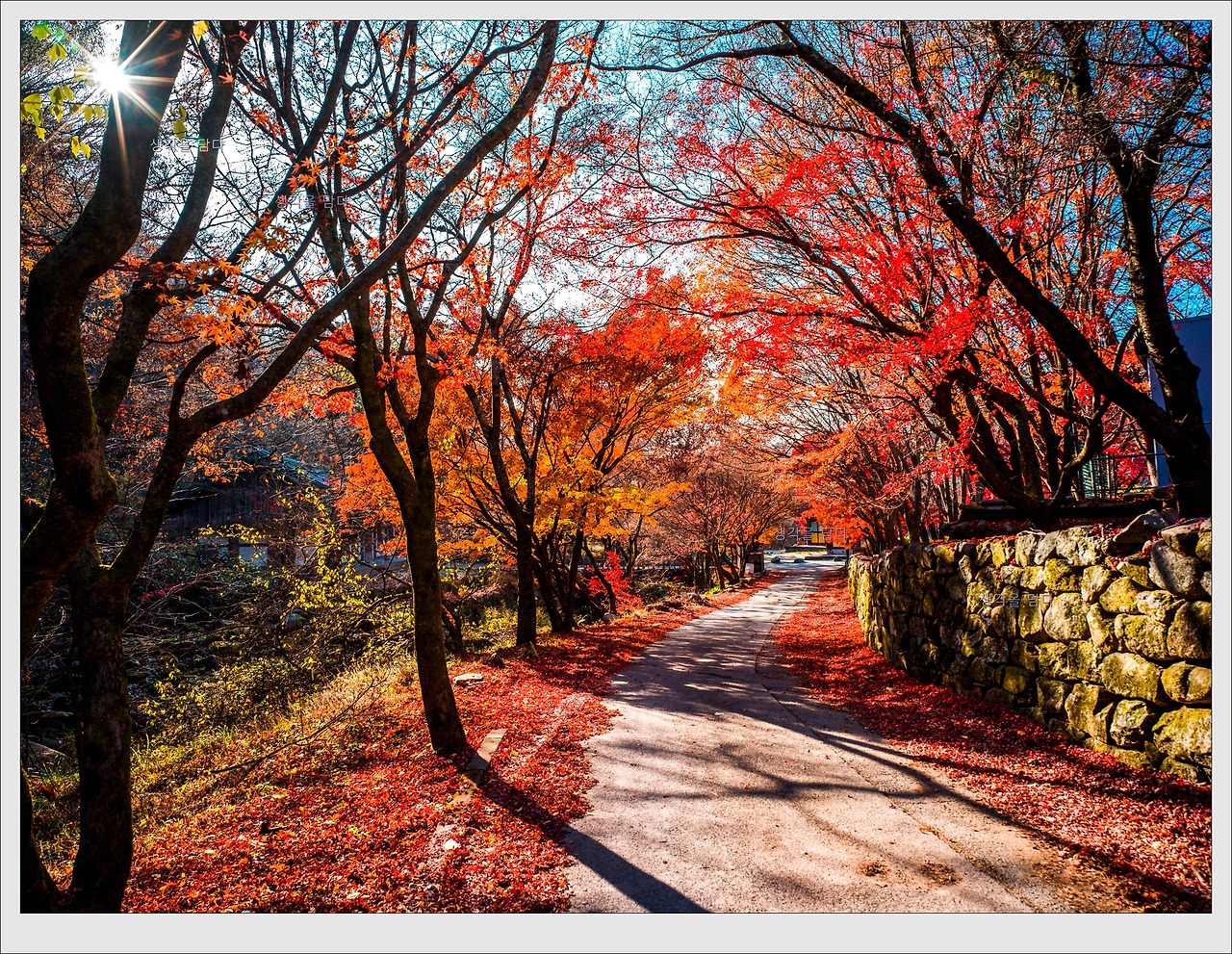 오후의 햇살을 받은 금산사 돌담의 단풍나무가 마지막 붉은 정열을 불태우고 있다.