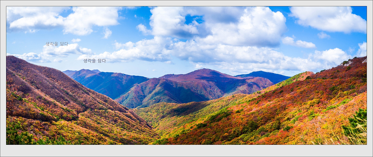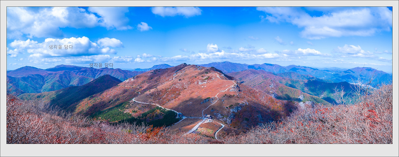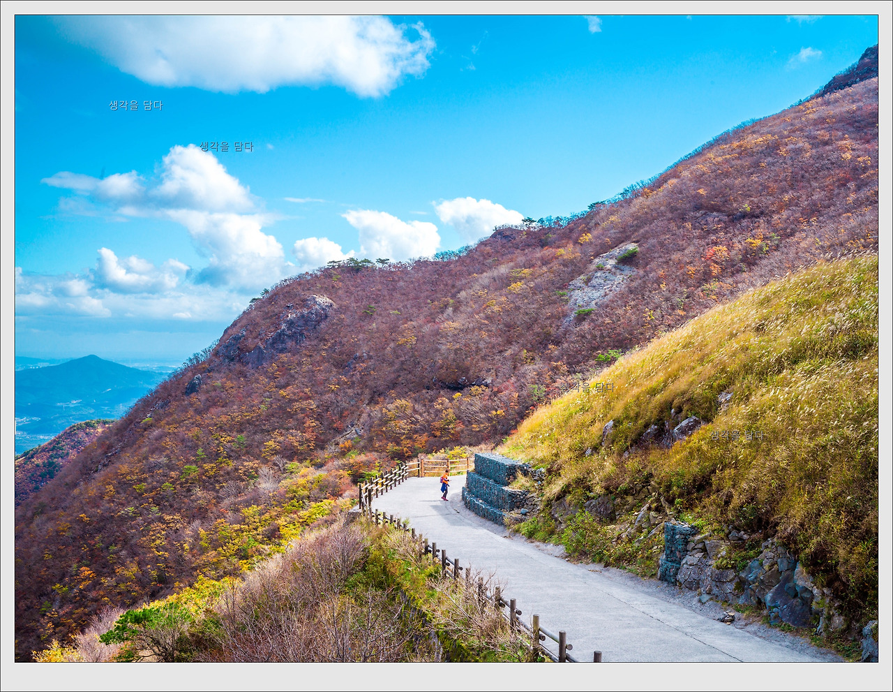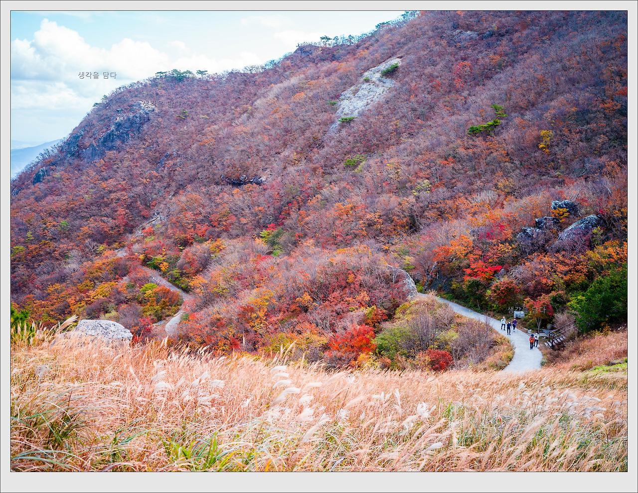 화사한 단풍으로 치장한 이 산모퉁이를 돌아가면 지금까지와는 다른 반대쪽 조망이 펼쳐질 것이다.