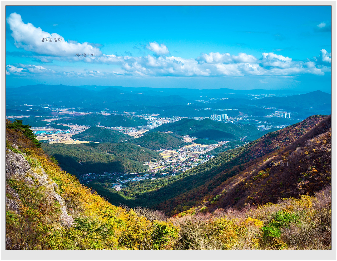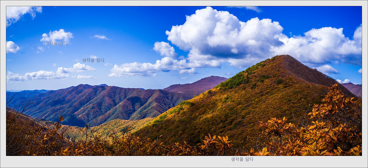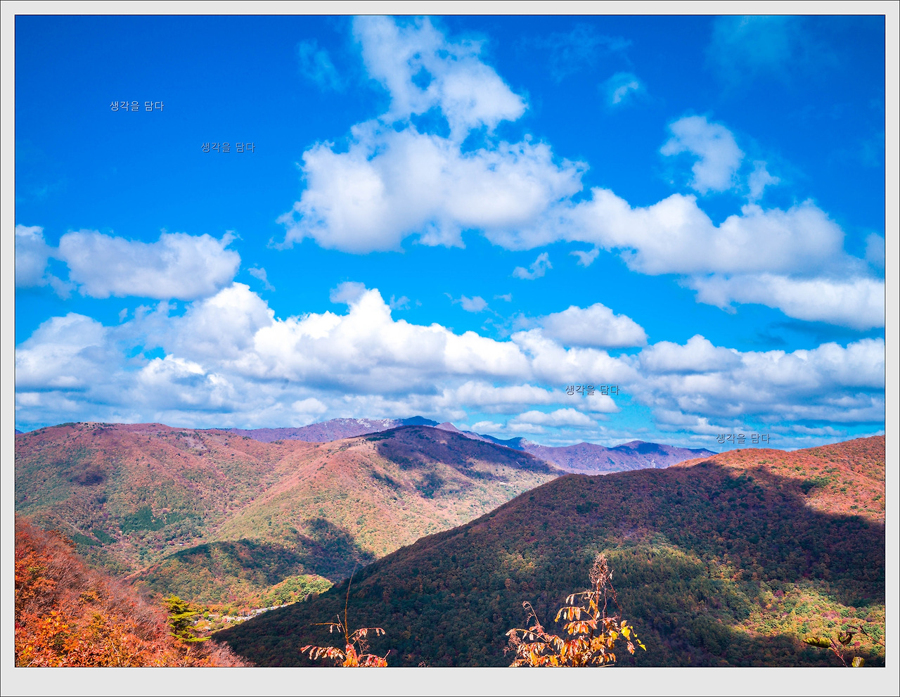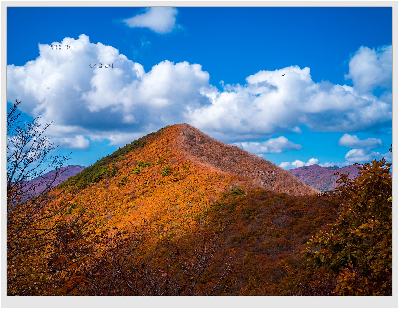 화사한 단풍으로 치장한 이 산모퉁이를 돌아가면 지금까지와는 다른 반대쪽 조망이 펼쳐질 것이다.