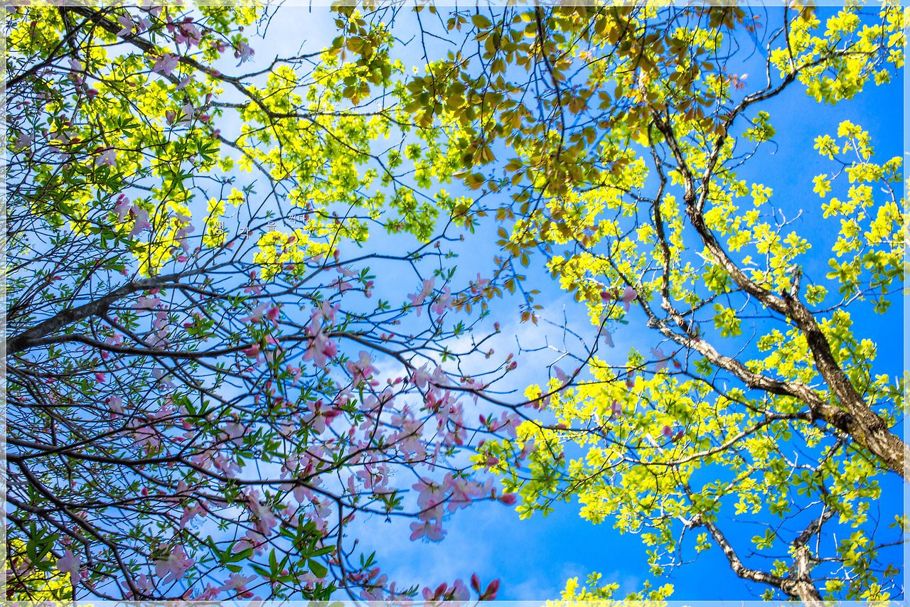 파란 하늘과 여린 연두색 나뭇잎을 배경으로 피어있는 산철쭉의 연분홍이 아름다운 조화를 이루고 있는 꽃그늘에서 잠시 멈춰섰다.