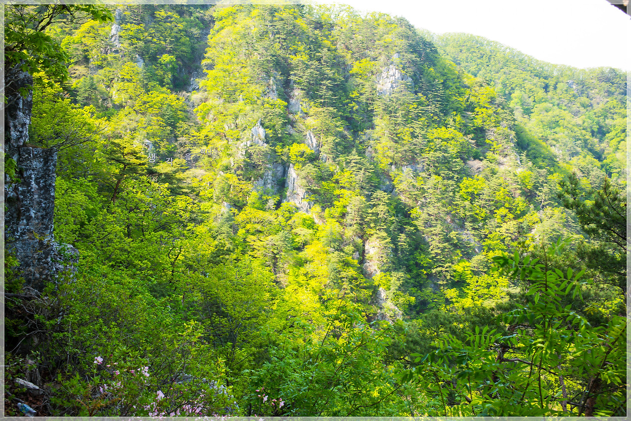 그나마 계곡의 물소리가 좋고,울창한 숲그늘이 좋고,청아한 산철쭉의 하늘거림이 좋아서 위안이 되었던 시간 뒤에 오는 첫 조망,그리고 1000m의 고지대 답게 이제서야 막 피어나기 시작한 연푸른 잎이 3시간여의 피로를 한방에 날려주었다.