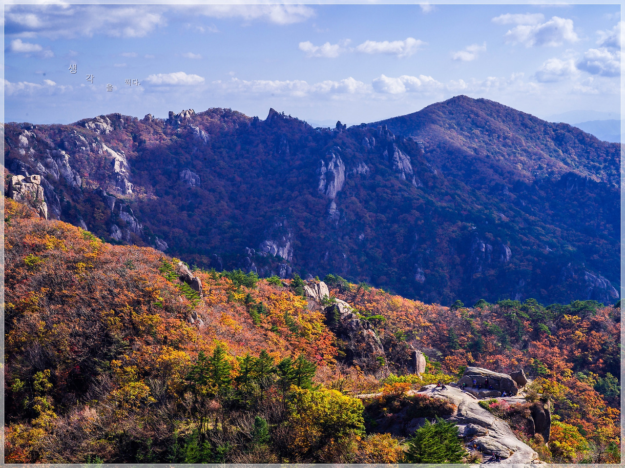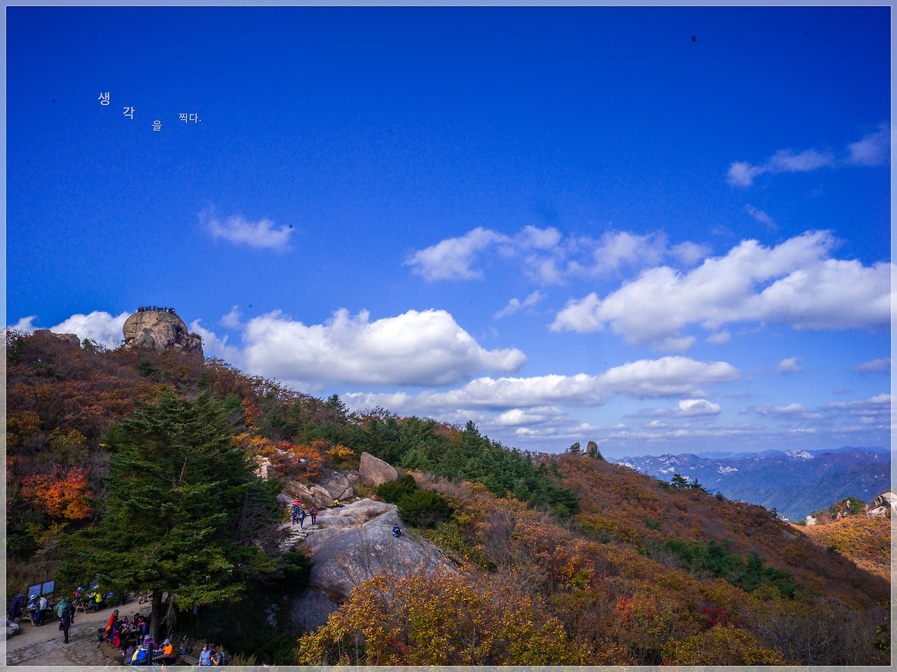 울긋불긋 형형색색 화려한 풍경위로 파아란 하늘과 흰구름이 어우러진 천상의 풍경을 앞에두고 먼저 오른 산객들이 올라오는 수고로움은 벌써 잊은듯 따스한 가을 햇살을 받으며 한가로운 여유를 즐기고 있었다.