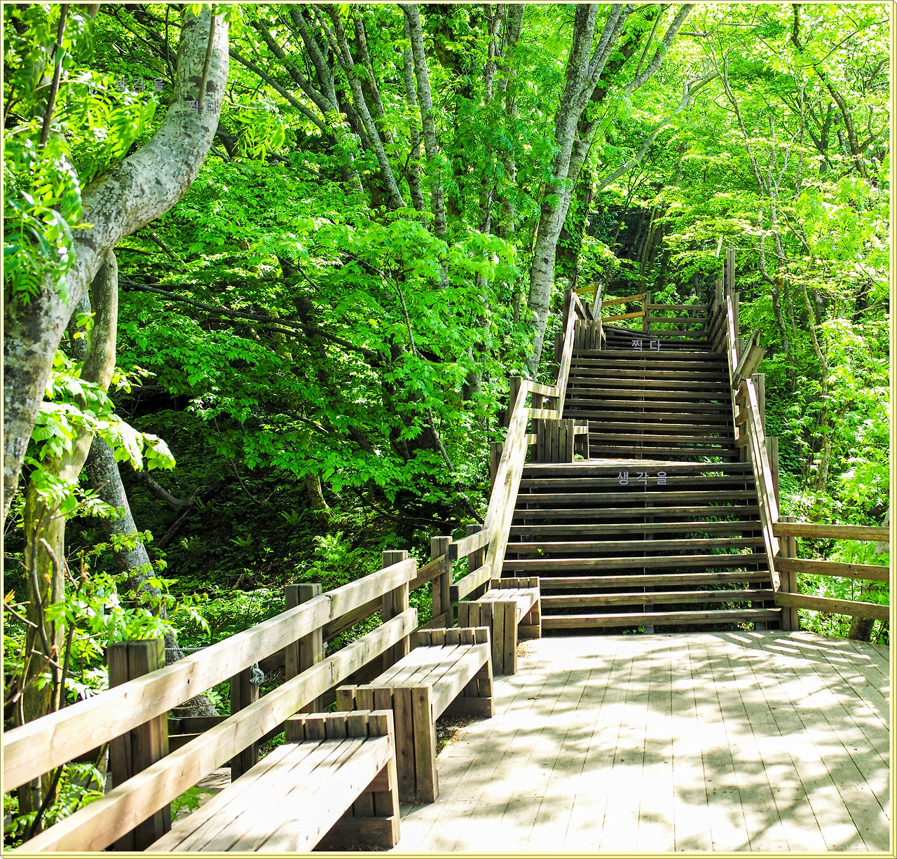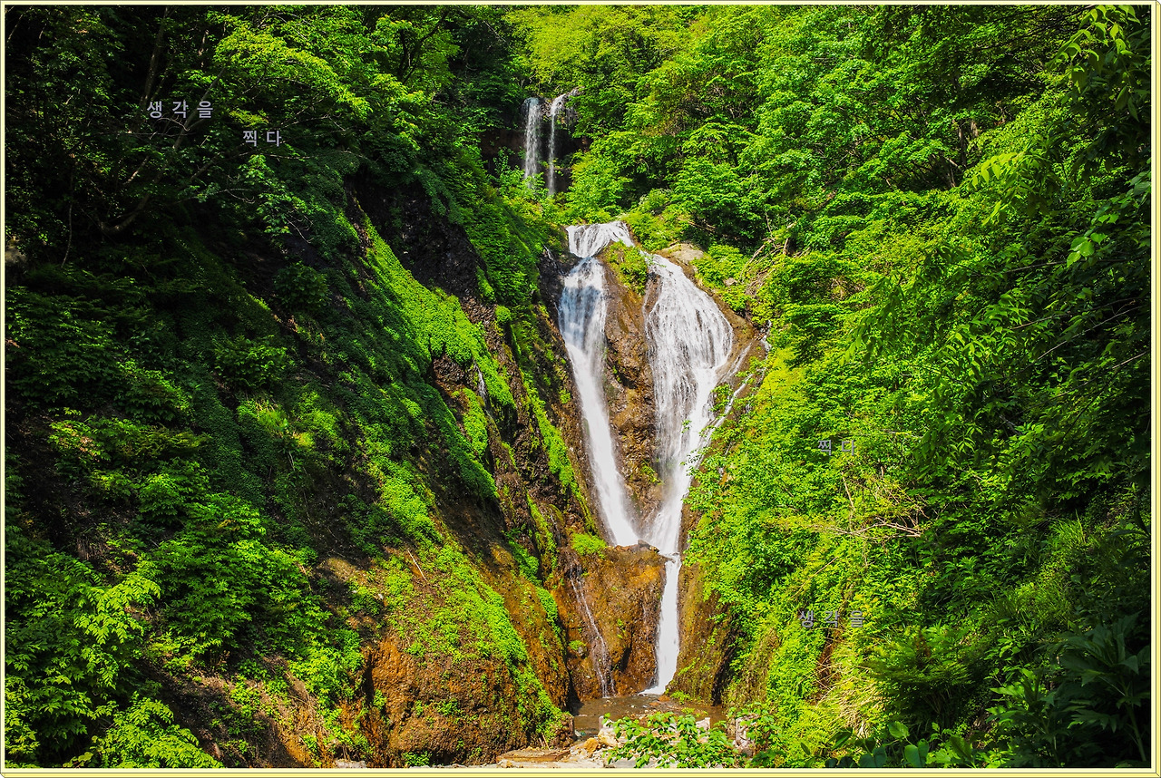 풍부한 수량의 하얀 물줄기가 연두빛 숲에 싸여있어 금방 선녀라도 나올듯이 신비스러웠다.