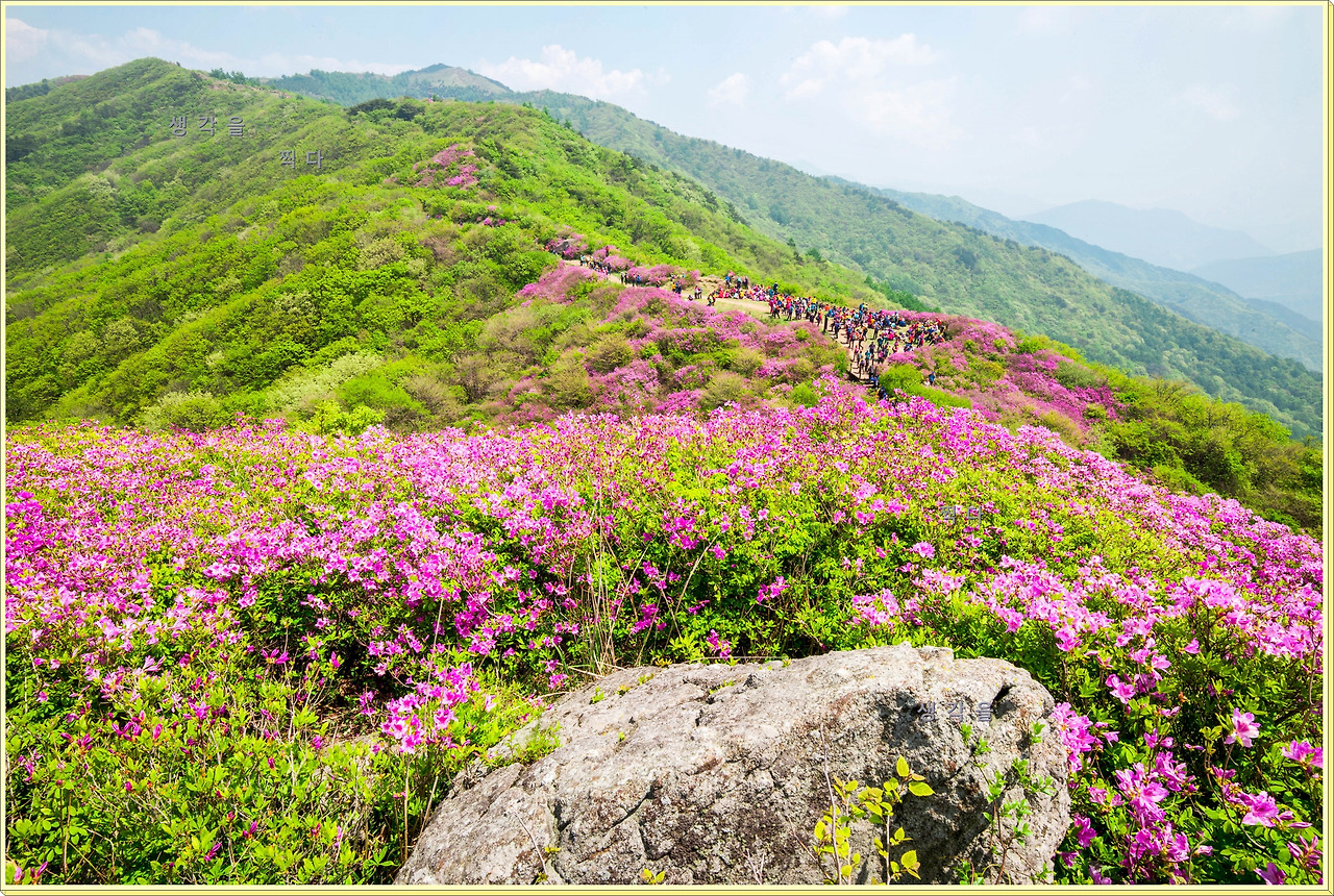 꽃구름과 연초록 초원의 여백,그리고 형형색색 사람 구름과 파란 하늘의 흰구름까지.