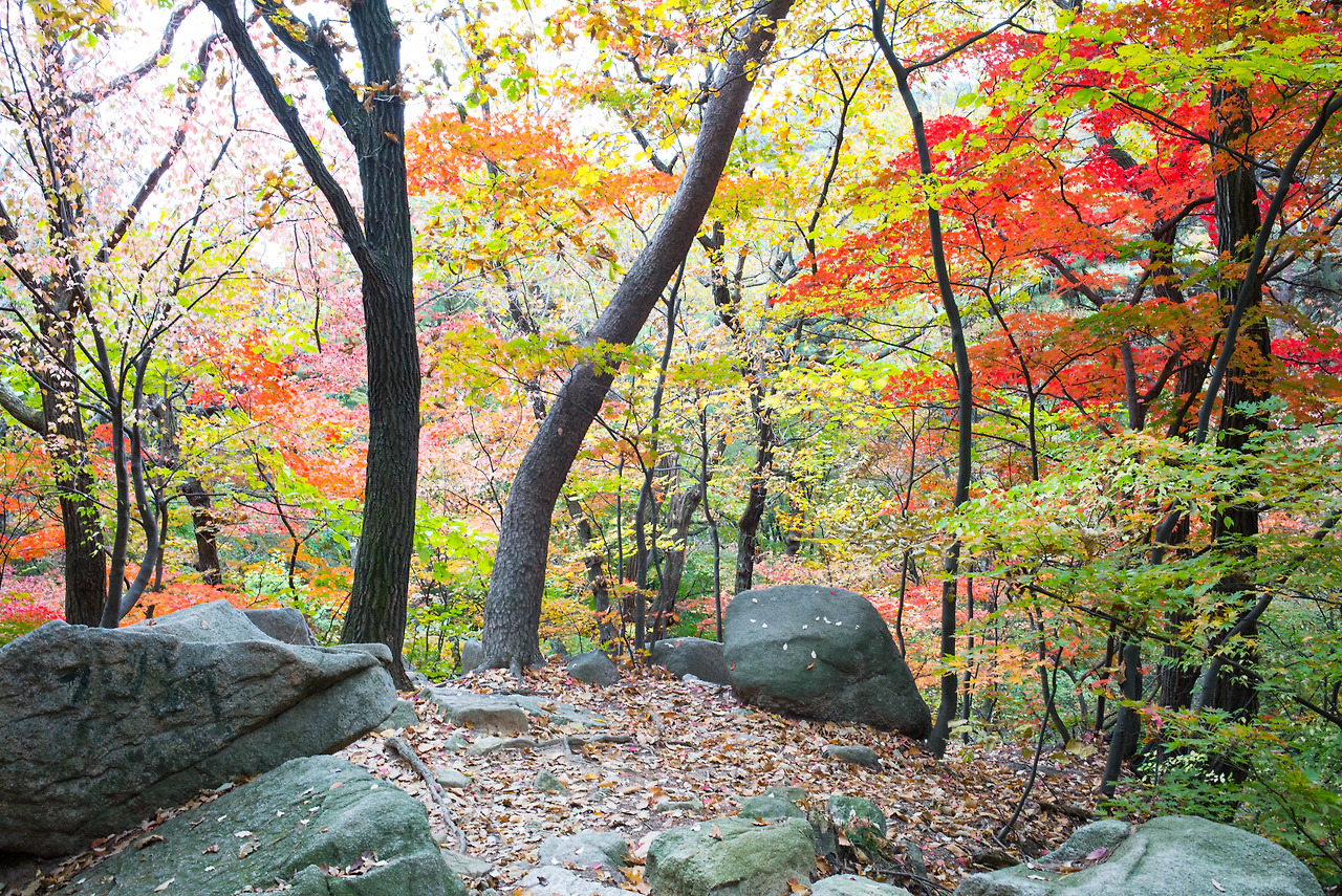 바위와 푸른색 소나무 사이에 총총히 박혀있는 빨갛고 노란단풍의 아름다운 풍경에 잠시 넋을 놓는다.