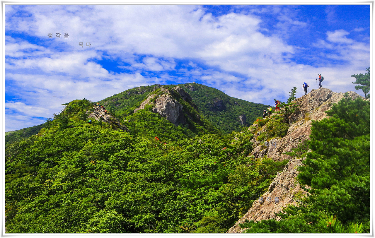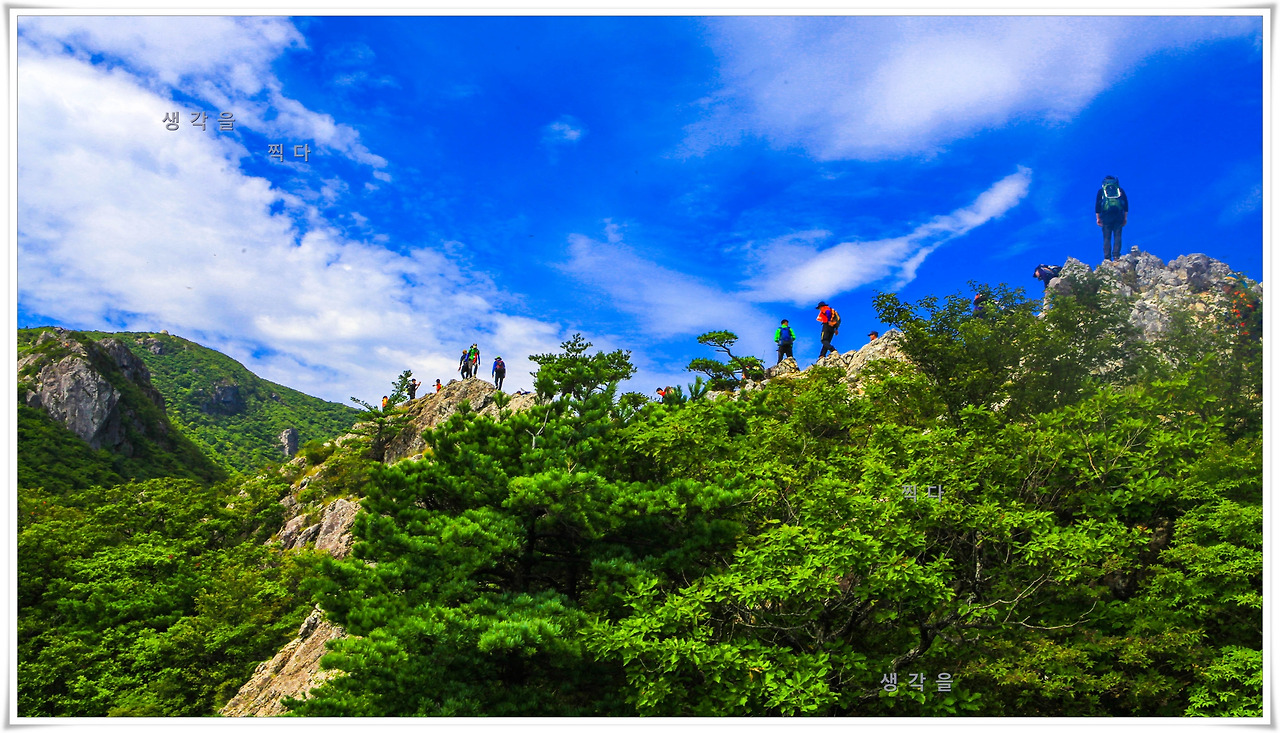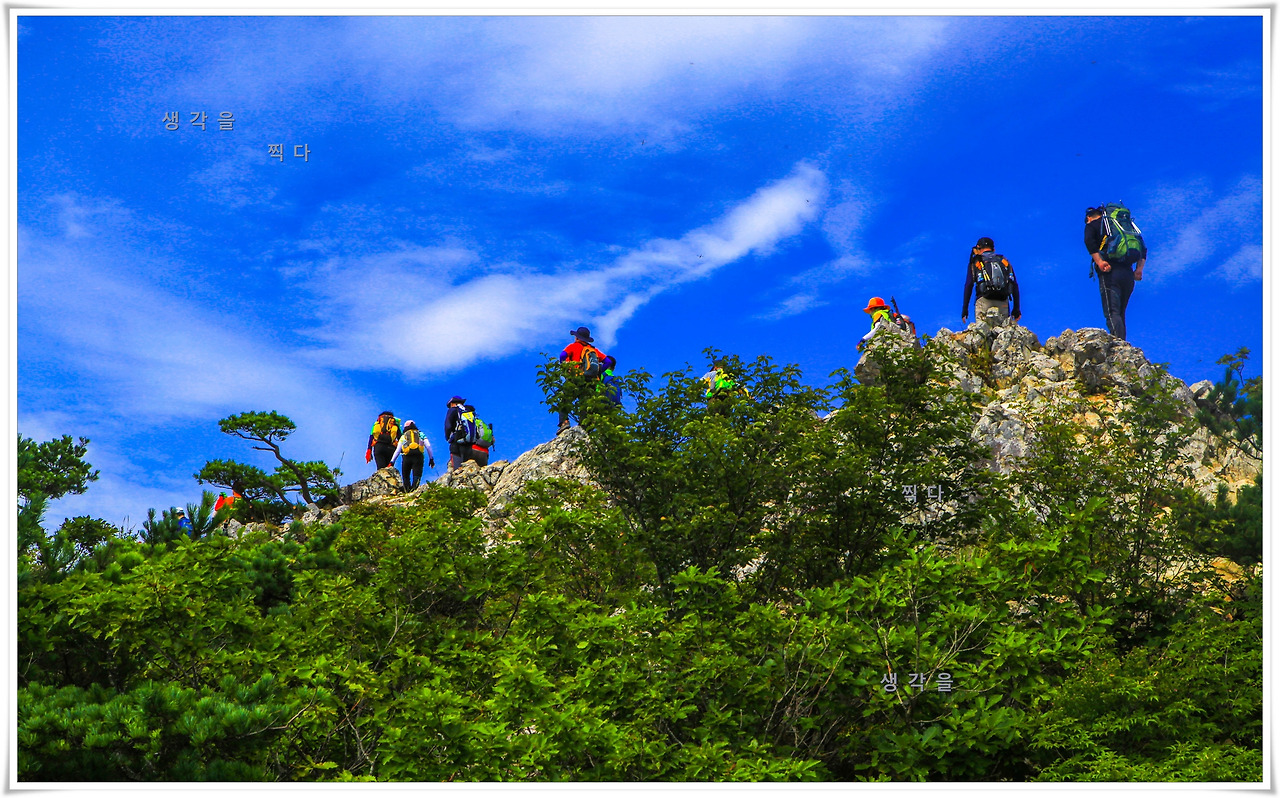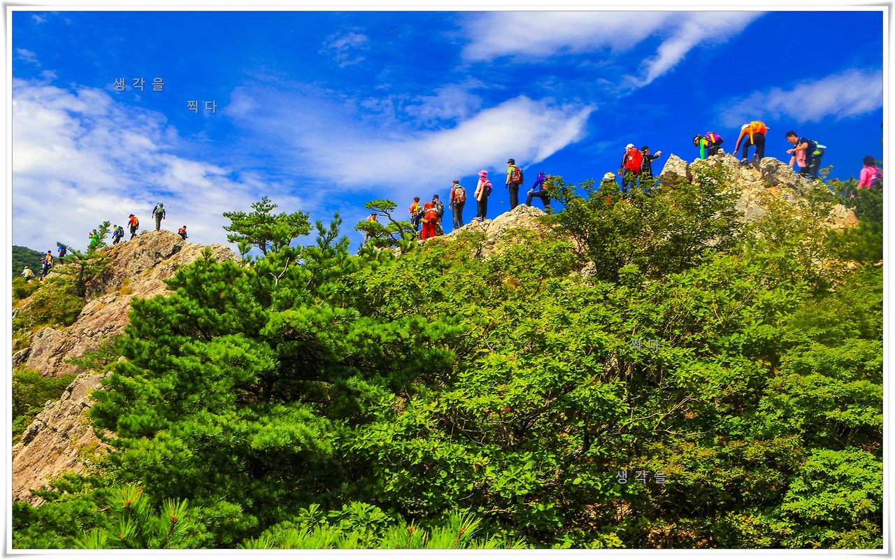 푸른 하늘을 배경으로 늘어선 산객들의 모습이 장관을 연출하고 있다.