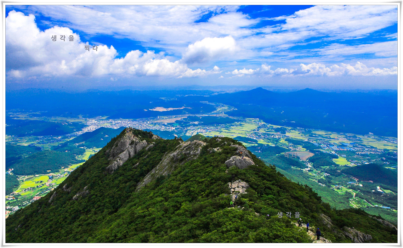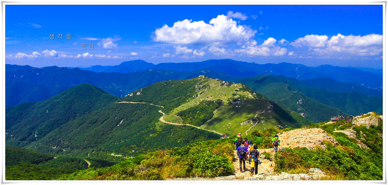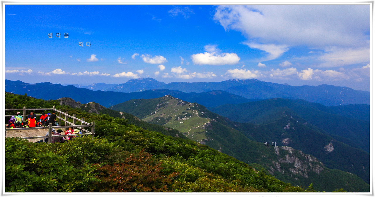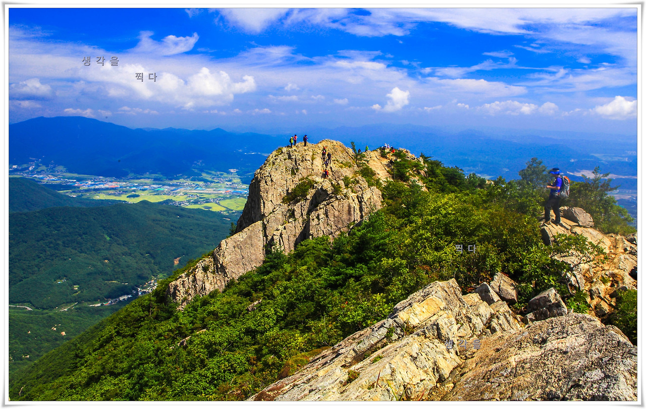 푸른 하늘을 배경으로 늘어선 산객들의 모습이 장관을 연출하고 있다.