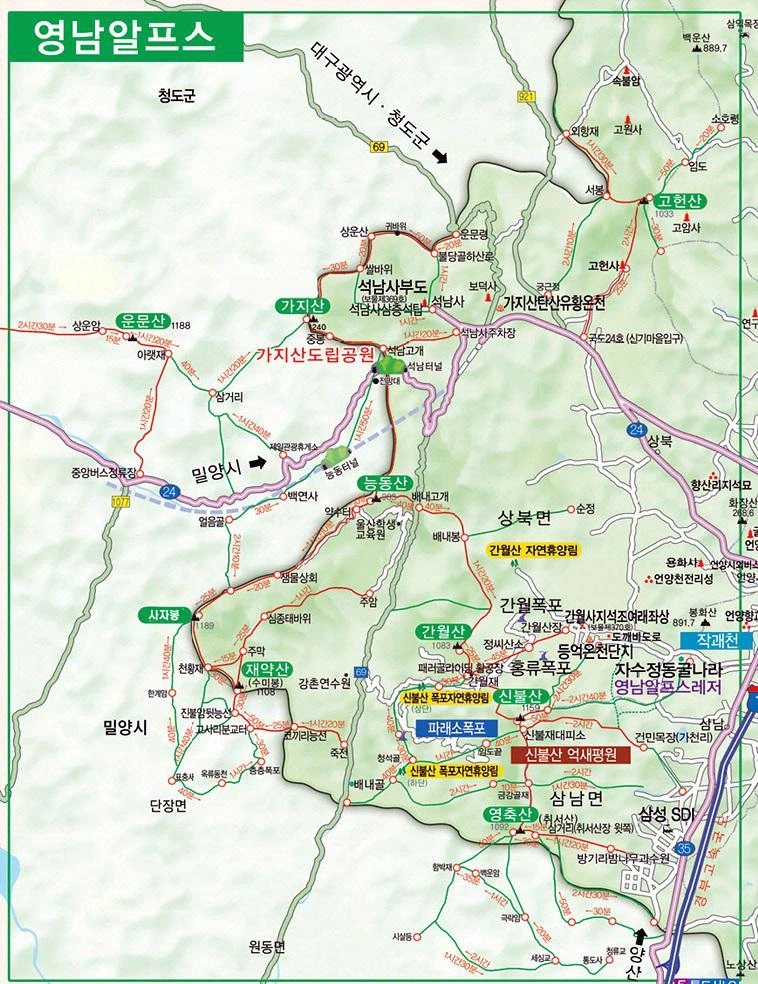 영남알프스 산군중에는 산림청선정 100대 명산에 포함된 산이 4곳이다.