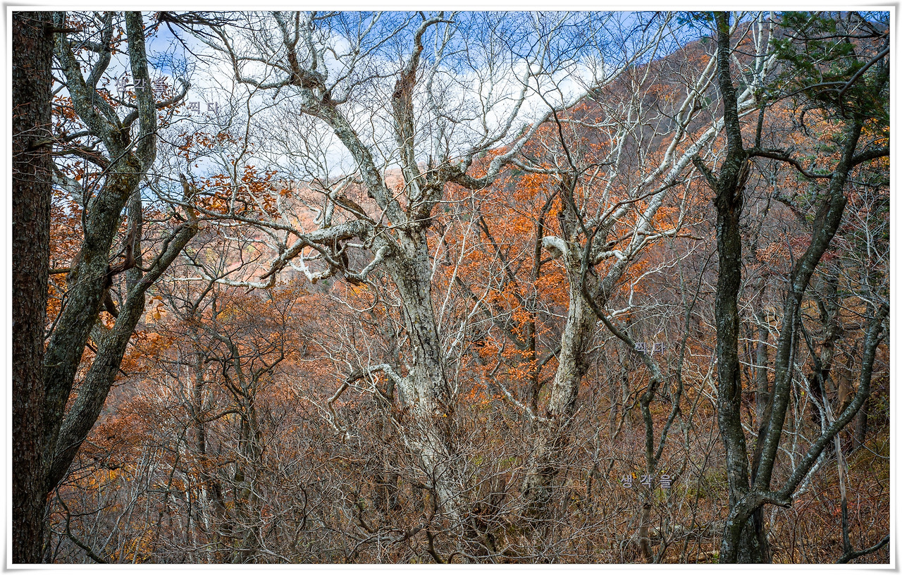 그래도 까마득하다는 생각보다는 발걸음이 가벼워지는 느낌이 앞서는 것은 계속 완만한 내리막 길이라는 것과 내려설 수록 화려해지는 단풍 때문이다.