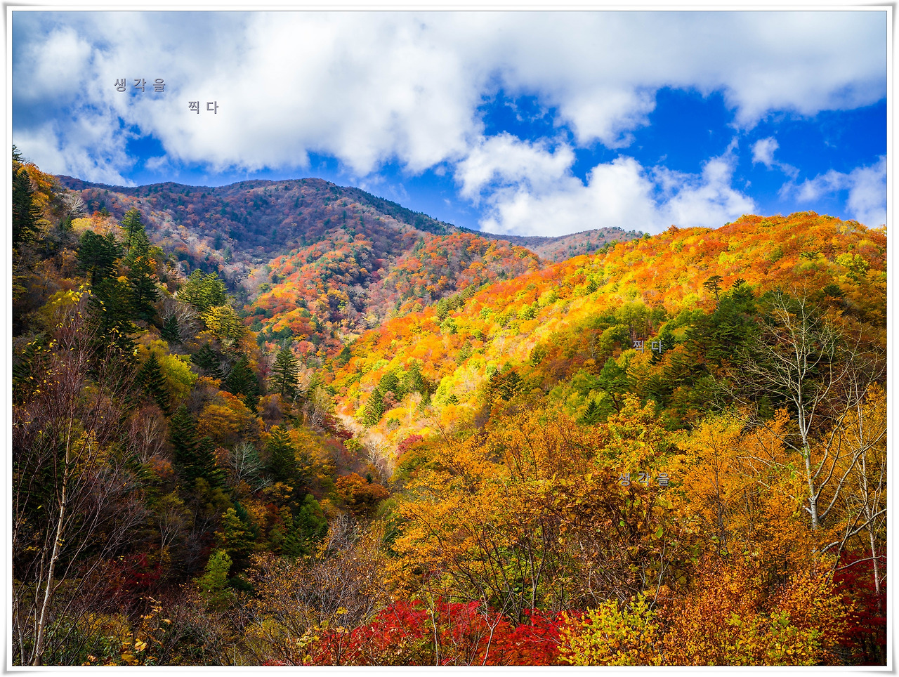 빨,주,노,초의 조화가 절정을 이룬 부드러운 산능선 위로 파란 하늘에 흰구름이 두둥실 떠가는 가을 하늘이 펼쳐졌다.
