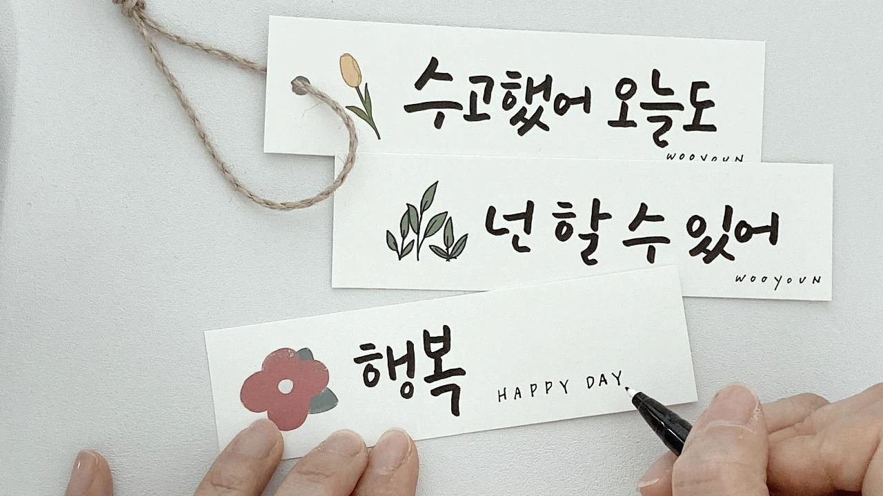 앞에서 설명드린 손글씨 예쁘게 쓰는 팁의 내용을 기억하시면서 단어와 문장으로 작은 종이에 책갈피를 만들어보세요. 활용할수록 손글씨 쓰는 게 즐거워지실 거예요.