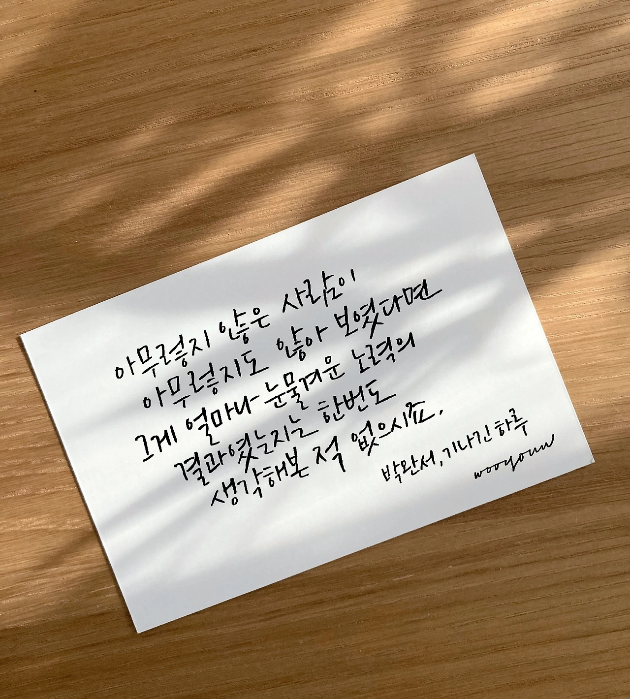 물건과 텍스트로만 전해지는 세상에서 한 글자 한 글자 꾹꾹 눌러가며 쓴 손글씨는 받는 사람에게 작은 감동과 울림을 줍니다.
