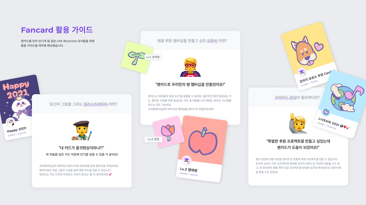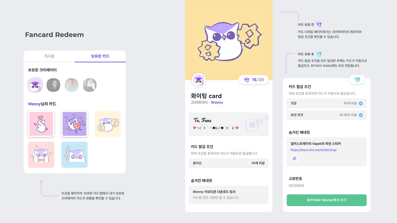 저희 팀은 이런 소통이 유일무이한 토큰 형태(NFT)로 저장되는 아이디어로 발전시켰어요. 크리에이터는 후원과 관심을 보내준 팬에게 의미 있는 선물을 NFT로 보낼 수 있고, 팬은 카드와 보상을 모아 크리에이터와 더 가까워질 수 있습니다.