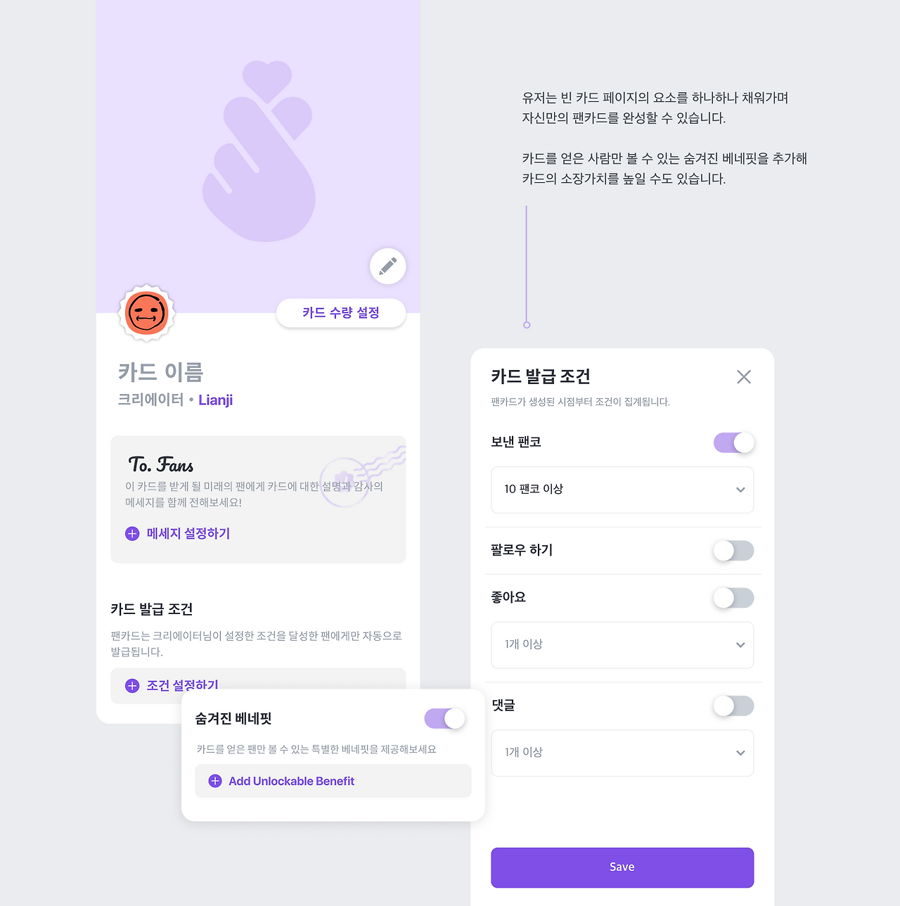 크리에이터는 팬카드의 발급 조건을 자유롭게 설정할 수 있어요. 팔로우 1번이나 좋아요 1번 만으로도 얻을 수 있는 NFT를 발급할 수 있습니다.