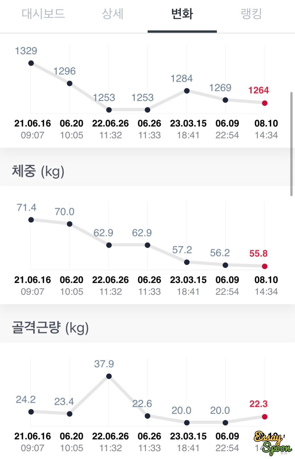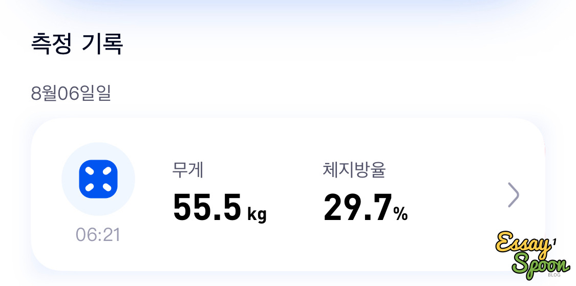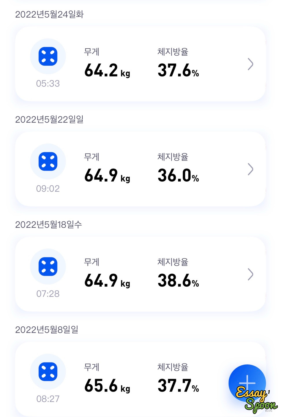 핸드폰에 저장되는 체중계를 구매한지 얼마 안 돼서 이전 몸무게는 나와있지 않고, 체중이 너무 많이 불었을 때에도 몸무게를 제지 않아서 다 보여줄 수 없어서 아쉬움이 있다. 그리고 조금 부끄럽다.