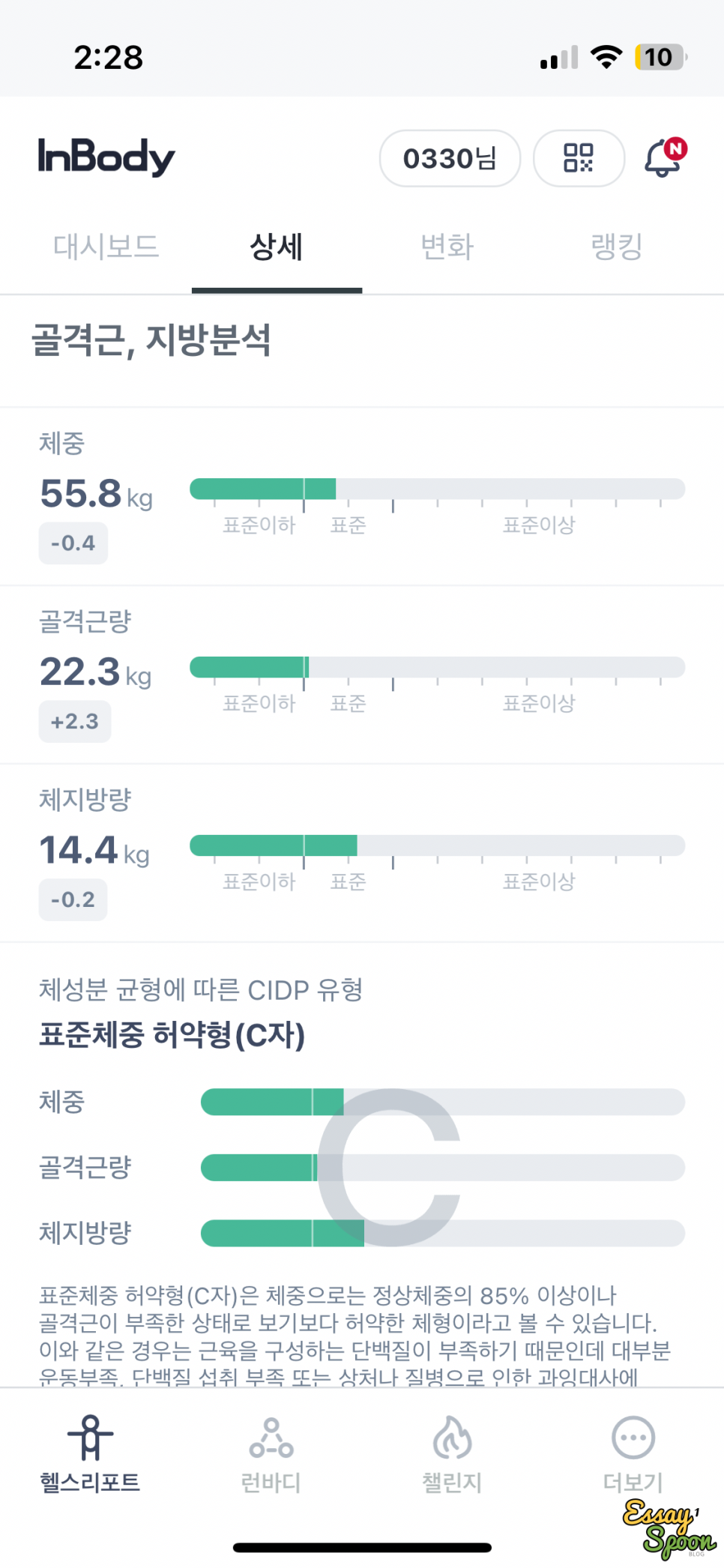 아직 내 몸에는 근육이 많이 없고 체지방은 많다. 헬스장에서 인바디를 제 봤는데 c형이 나왔다. 이제는 근육량을 올리고 체지방을 줄이는 방법에 대해 생각해 보고 운동을 해보려고 한다.