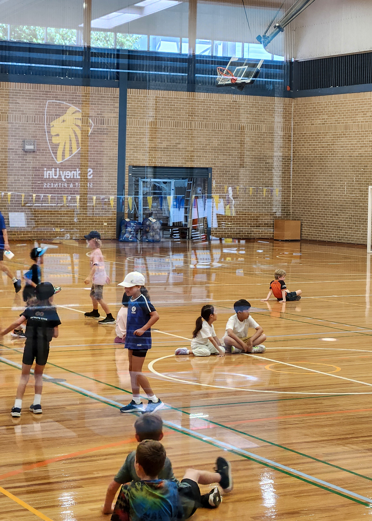 유리창 너머의 농구장에서 캠프 수업이 열리는 듯했다.
