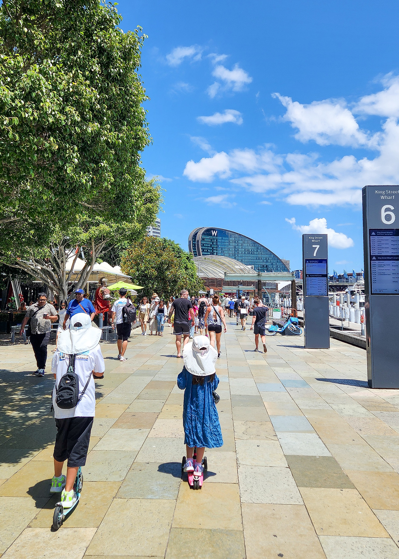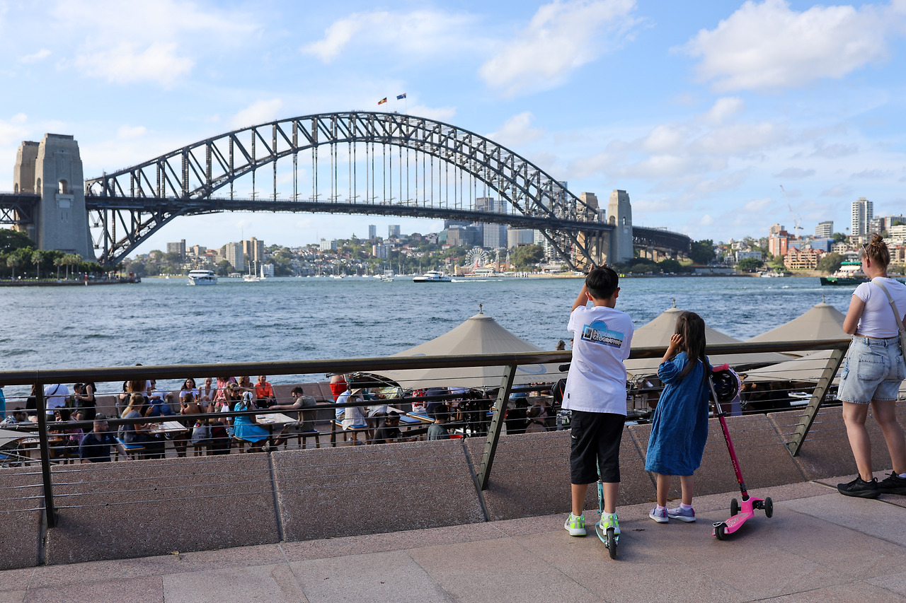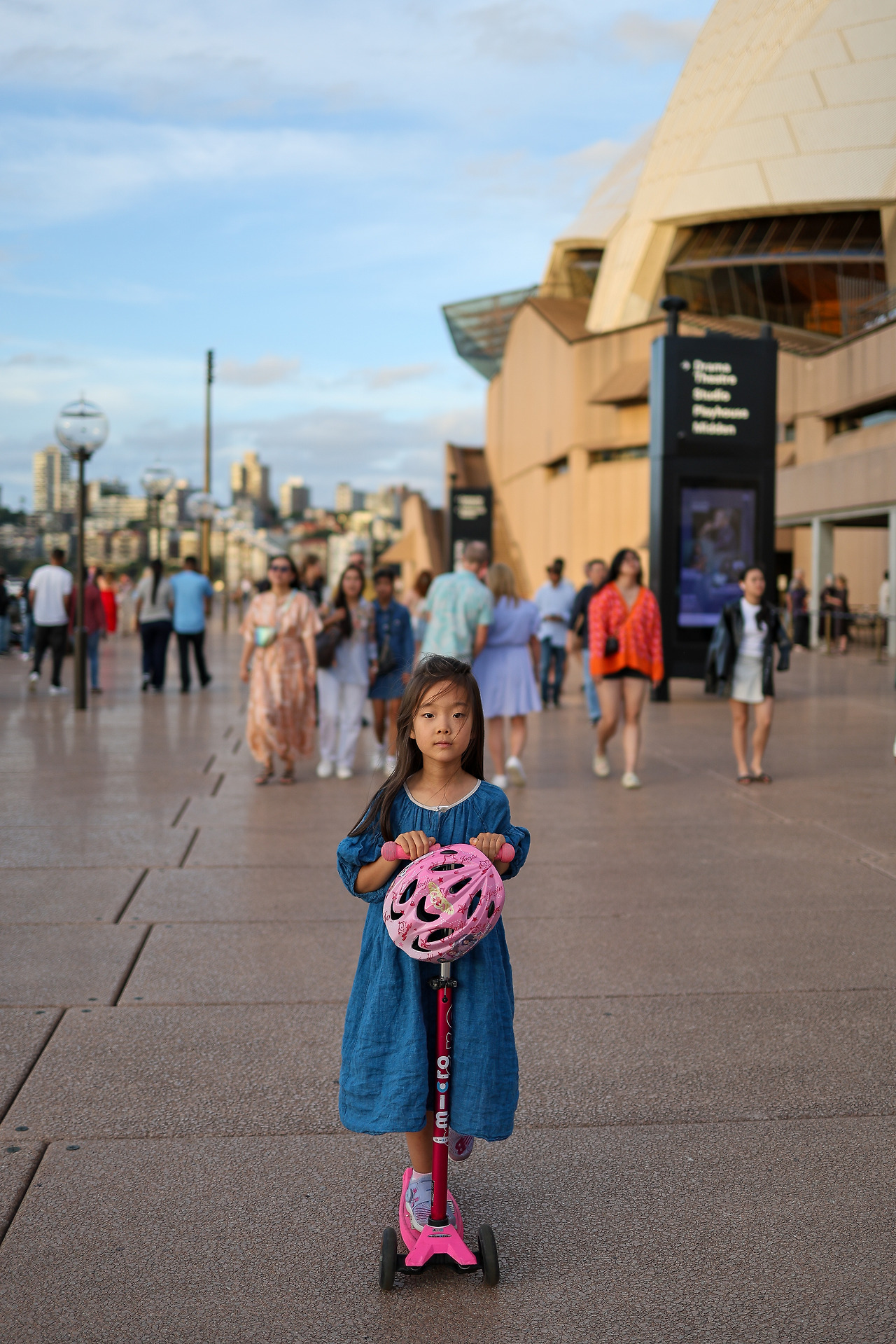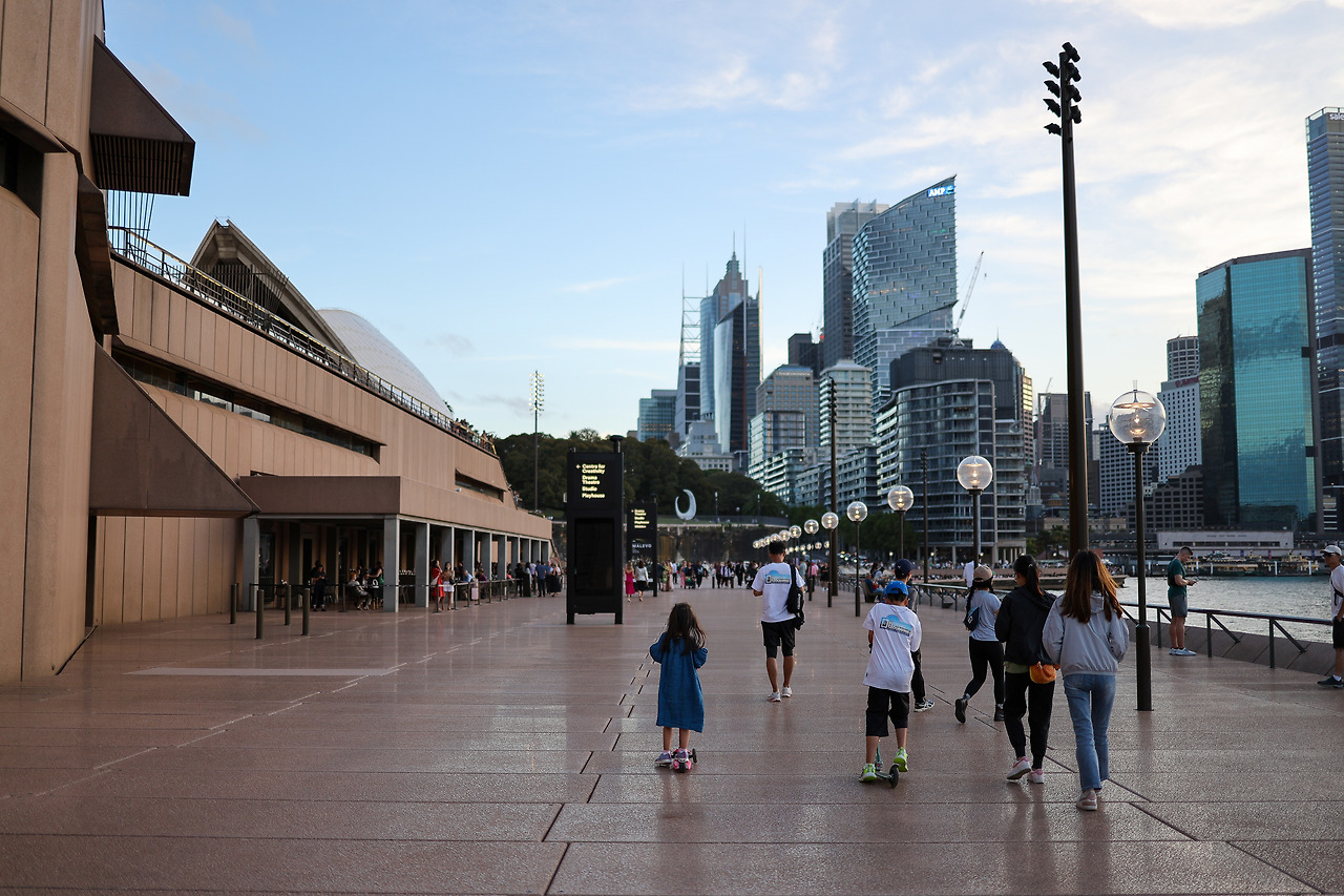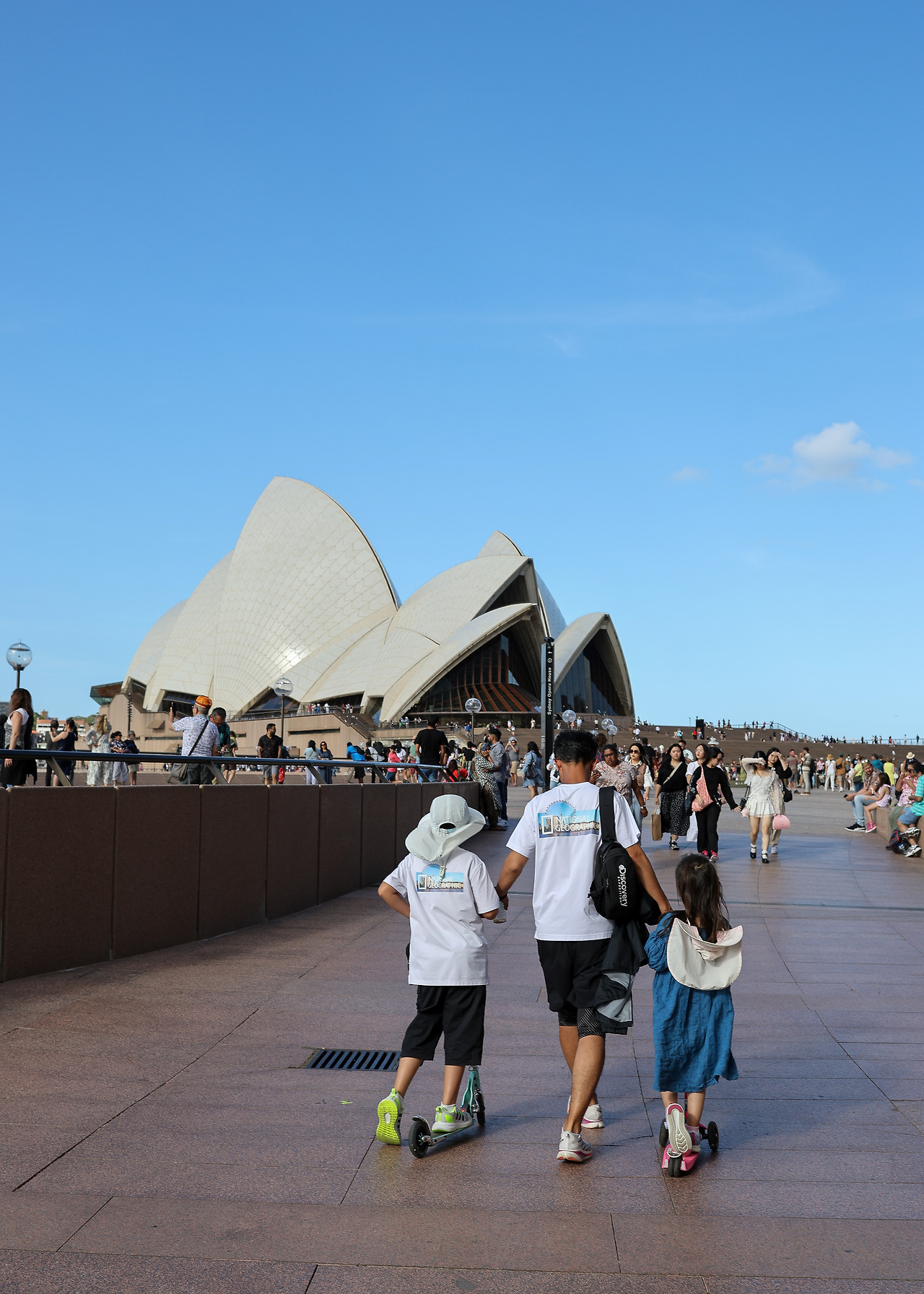 오페라하우스 앞에서 킥보드를 타는 아이들