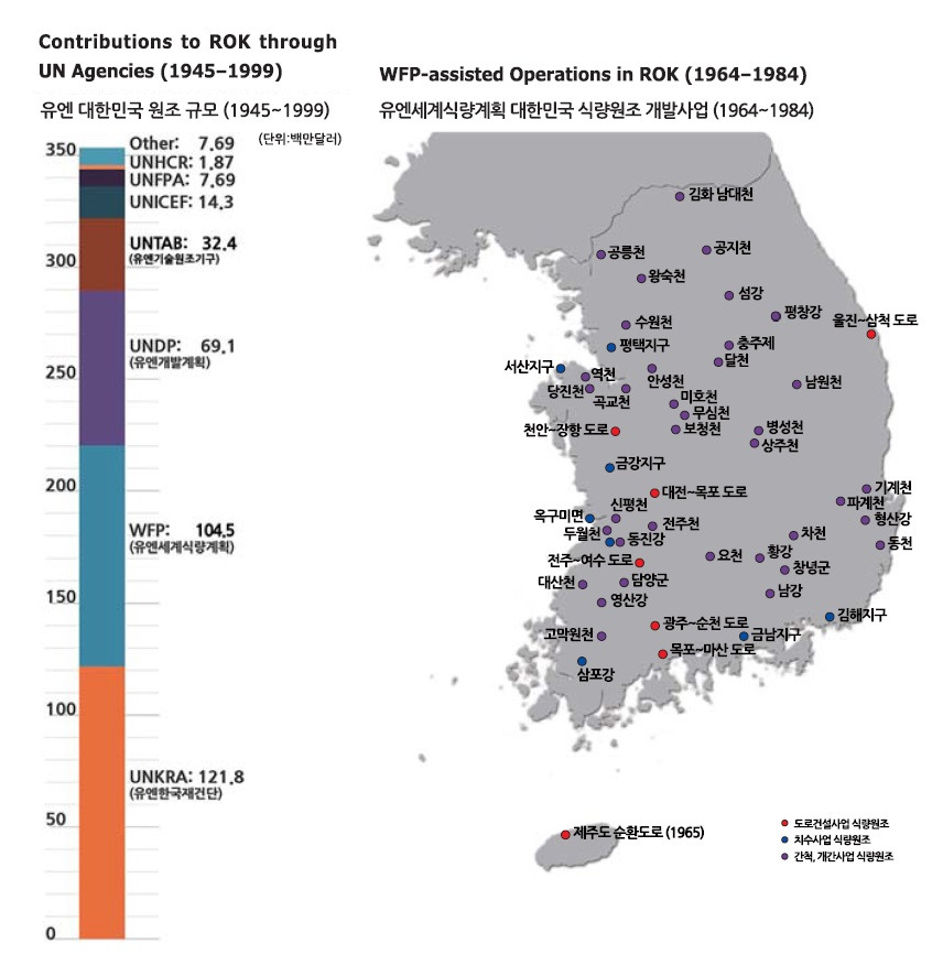 국회에서의 질문은 이 한 장의 사진으로 설명되지 않을까 싶습니다. 유엔한국재건단은 임시기구이니, 이미 존재하지 않습니다. 그러니까 현존하는 국제기구 중.. WFP는 다른 국제기구에 비해 압도적인 지원을 해주었습니다. 우리가 배고프고 가난할 때 말이죠.