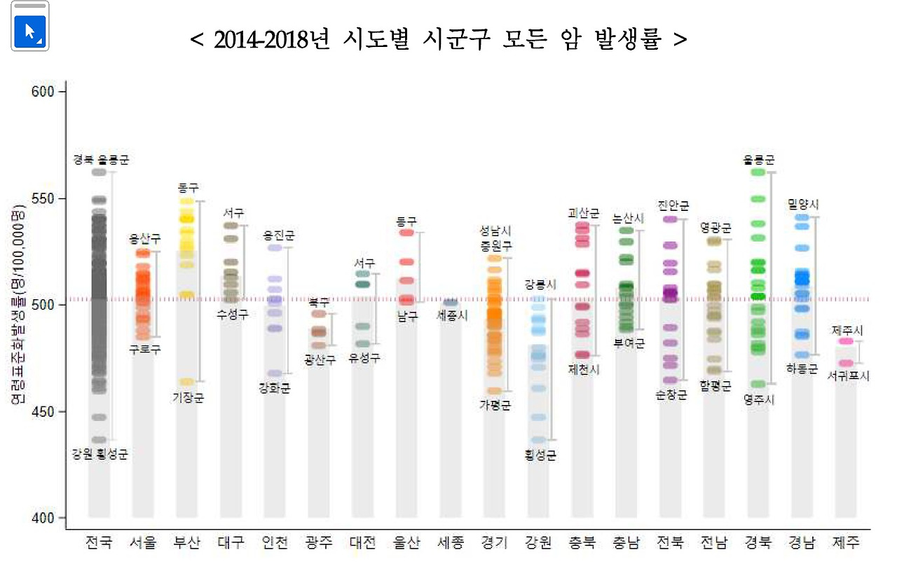 우리나라 암 발생을 시군별로 나누어 보면, 공기와 물이 맑은 농업지역이 도시지역보다 외외로 암발생률이 낮지 않은 것을 알 수 있다. 대도시의 경우, 공원이 많은 지역이라면 좀 더 암발생이 적어야 하지 않을까? 하는 의문이 든다.