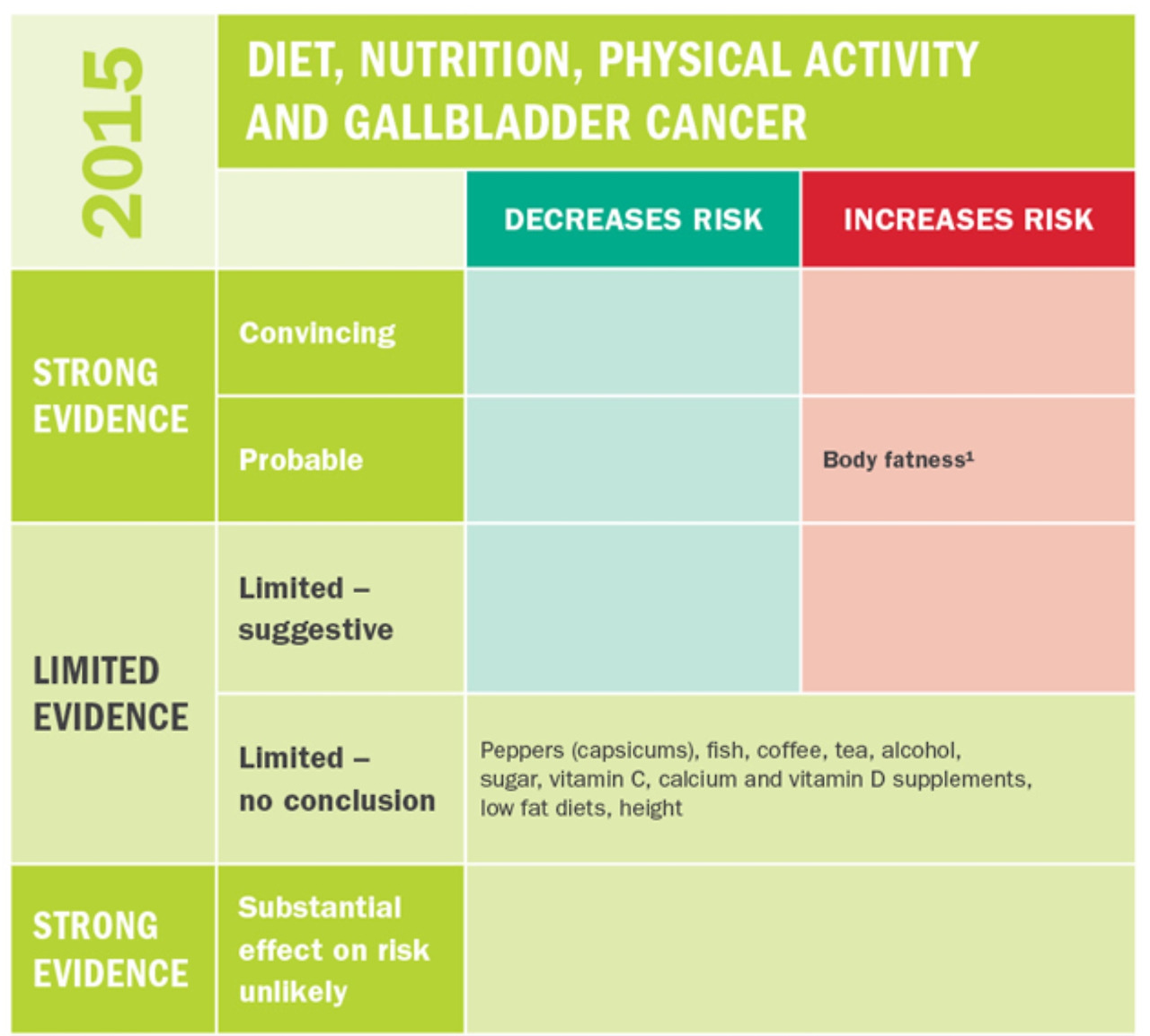 WCRF에 따르면 담낭암은 체중과 관련이 되어 있다. 담낭암의 발병기전을 잘 알려져 있지 않으며, 담석이 있으면 담낭암의 위험이 높아진다.