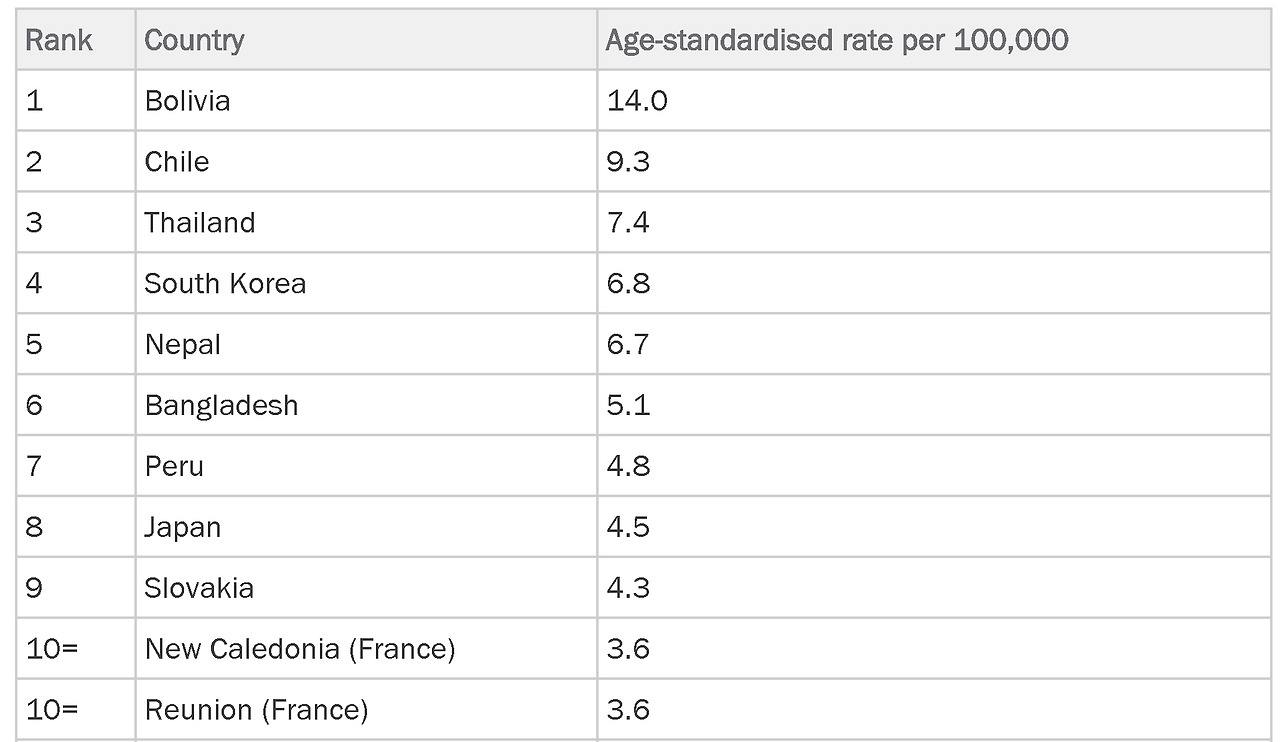 WCRF에 따르면 담낭암은 세계에서 17번째로 발생하는 암이라고 한다. 하지만 우리나라의 발생 순위는 세계에서 4번째. 생각보다 높음에 깜짝 놀랐다. 그리고 이웃나라 일본은 8번째다. 우리나라와 일본의 음식이나 생활습관 중 비슷한 게 무엇이 있을까?라는 의문이 자연스레 떠올랐다. 2018년 우리나라 암 통계에 따르면 담낭암의 5년간 생존율은 28.8 퍼센트다. 생존율이 무척 낮은 암이다.