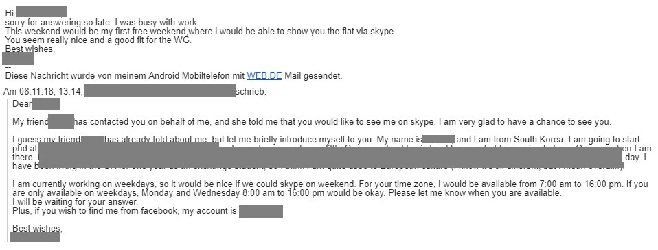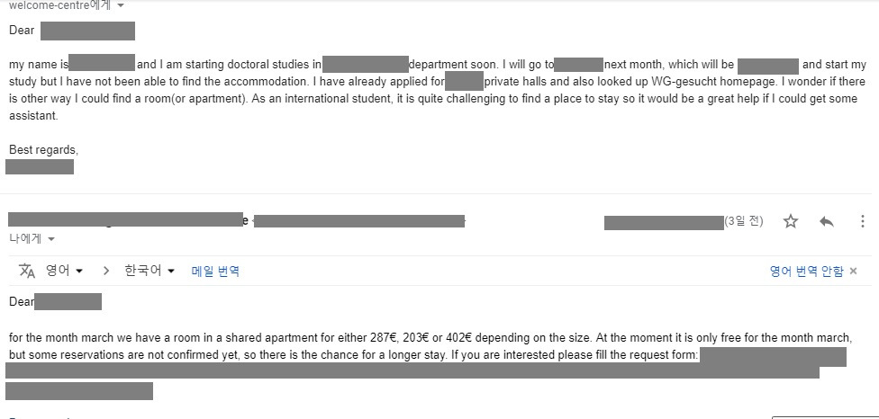 내가 쓴 방법은 나의 독일인 친구 S에게 도움을 요청하는 거였다. S가 나 대신 독일어로 지원 문자를 보내주었고 실제로 난 지금까지 세 군데에서 연락을 받을 수 있었다. S가 문자를 먼저 보내고, 그쪽에서 관심을 보이면 S가 내게 이메일 주소를 알려주었는데 첫 번째로 연락이 닿은 곳은 나의 어설픈 대처로 아쉽게 놓쳐버렸다.