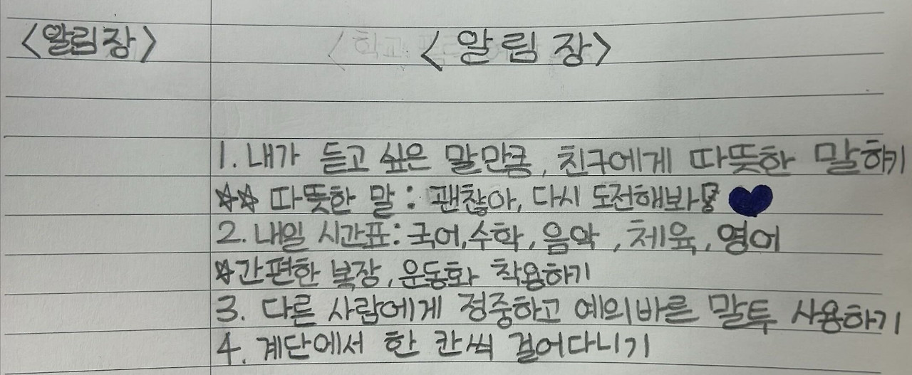 이야기를 들어보니 거슬리는 작은 행동과 말투 하나에서 시작한 다툼이었습니다. 항상 아이들에게 이야기합니다. 우리는 마법사가 아니라고. 말하지 않으면 상대가 내 마음을 알 수 없습니다. 그렇기에 나에게 상처를 주는 작은 가시 조각이 더 커지기 전에 미리 상대에게 알려주어야 합니다. 물론 정중하고 예의 바르게 전해야겠지요. 1학기 내내 했던 말을 2학기에도 다시 적어야겠습니다.
