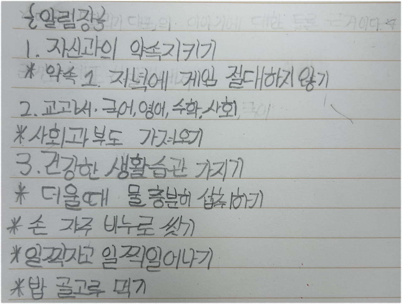 '아침밥과 저녁밥 모두 챙겨 먹기'로 약속을 정한 아이의 부모님이 "오늘은 웬일로 일찍 일어나서 밥을 먹니?"라고 깜짝 놀라 물어보셨다고도 하니, 작은 실천을 한 걸음씩 경험하고 있나 봅니다.