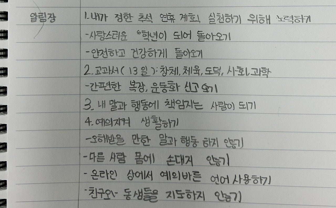 사실 저 말을 또 쓰게 될 일이 없을 거라 생각했는데, 올해에는 짧은 방학이라 부를 만큼 긴 연휴가 있어 다시 한번 알림장에 쓰게 되었습니다.