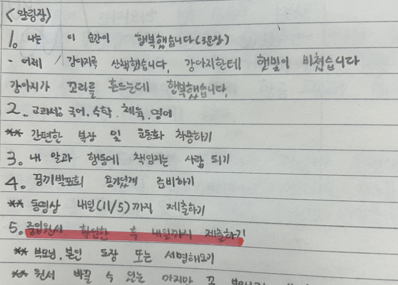 이번 주 알림장 1번은 세 문장으로 행복한 순간 찾기임을 미리 알려줍니다. 깊은 숲 속이라 할지라도 발길 닿는 곳에 길이 생겨나듯, 우리의 삶도 우리가 생각한 대로 길이 만들어집니다. 행복한 순간을 찾아내고 나누는 것도 연습이고 습관입니다. 오늘의 작은 생각이 모여 우리 아이들이 행복의 길을 만들어가길 바라봅니다.