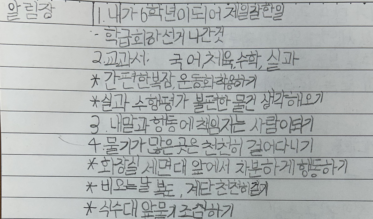 초등학교 생활이 끝을 향해 나아갑니다. 이번 주부터 6학년 마지막 프로젝트 활동인 '개인문집'을 만들기 시작합니다. 졸업까지 일주일에 두세 편씩 초등학교 생활을 되돌아보며 주제에 맞춰 글을 쓸 계획이지요. 글쓰기에 앞서 알림장을 통해 글감을 미리 모아봅니다. 이번 주 주제입니다.