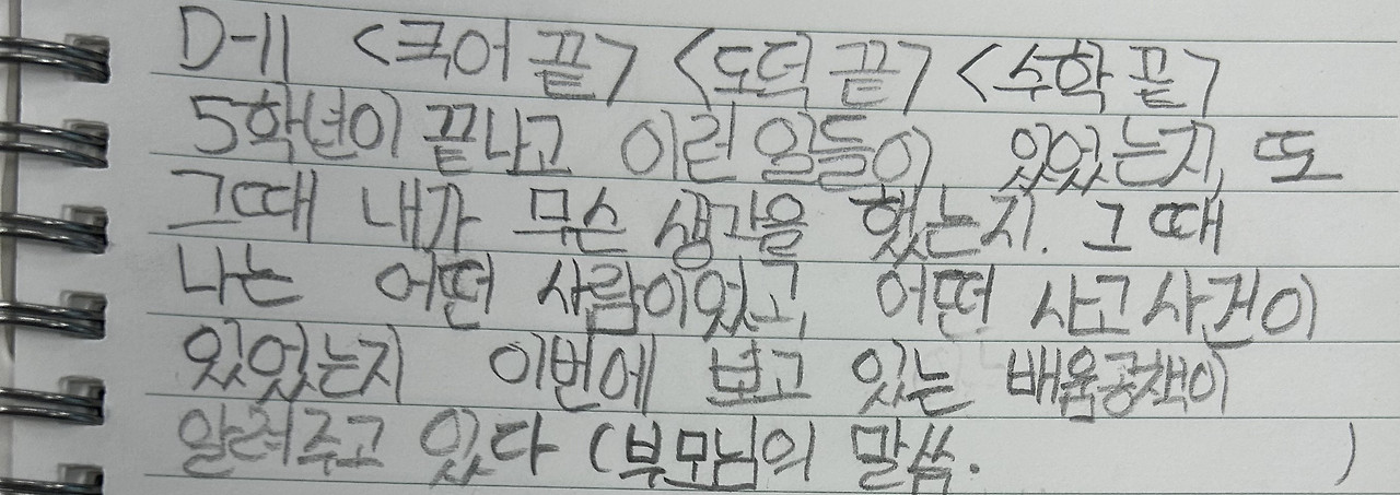 부족한 선생님에게 이만큼 배워주고 잘 따라 준 내 아이들에게 고맙다고 전하고 싶습니다. 이제 남은 10일을 후회 없이 보낼 수 있도록 마지막까지 이 마음을 잘 전해야겠습니다.