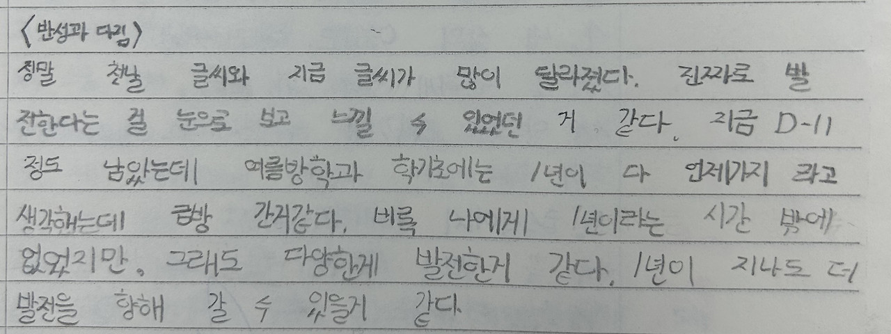 아이들도 본인들의 변화를 눈으로 보고 벌어진 입을 다물지 못합니다. 자신의 성장을 글로 정리하는 것도 잊은 채 자신들이 쌓아온 1년 치 기록에 정신이 팔려 있습니다.