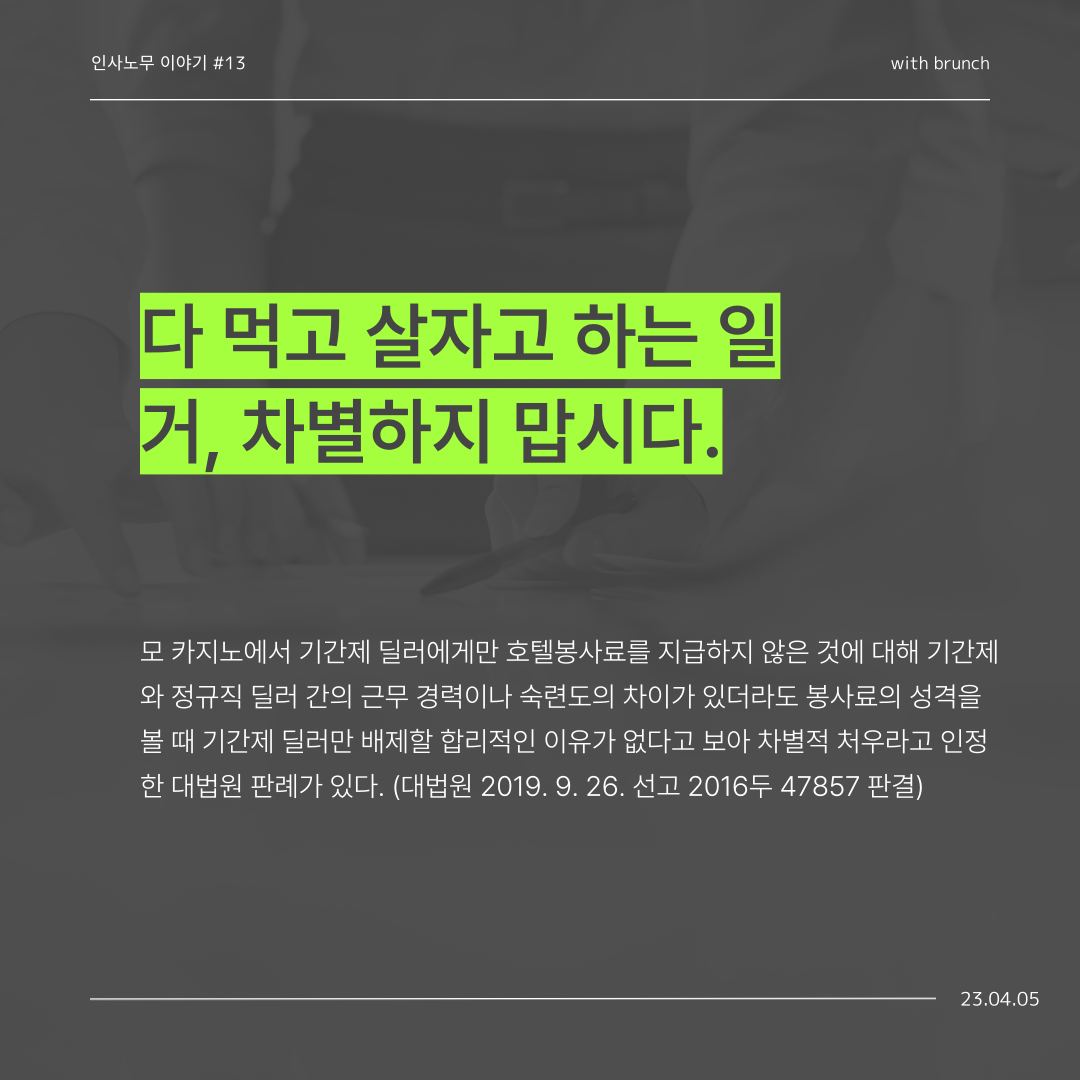 모 카지노에서 기간제 딜러에게만 호텔봉사료를 지급하지 않은 것에 대해 기간제와 정규직 딜러 간의 근무 경력이나 숙련도의 차이가 있더라도 봉사료의 성격을 볼 때 기간제 딜러만 배제할 합리적인 이유가 없다고 보아 차별적 처우라고 인정한 대법원 판례도 있다. (대법원 2019. 9. 26. 선고 2016두 47857 판결)