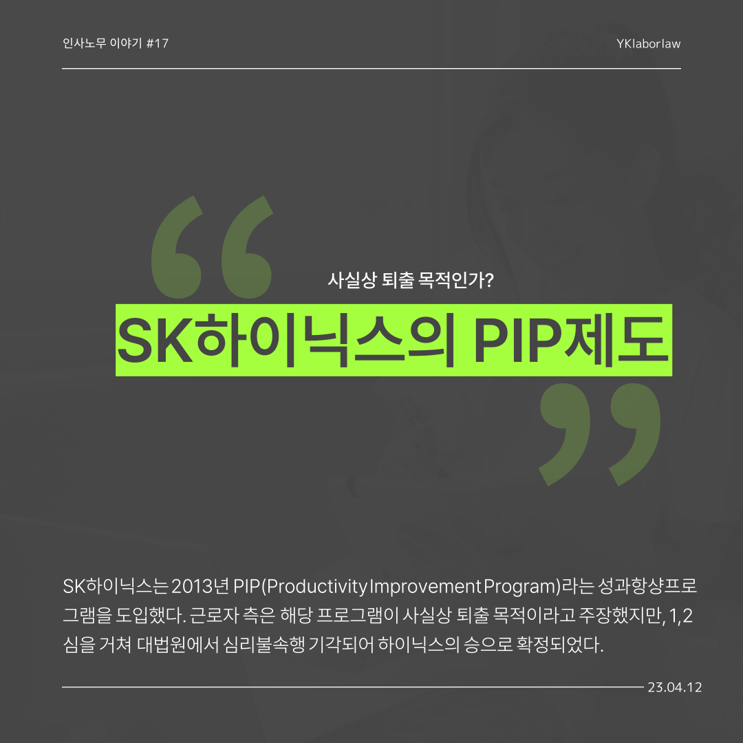 A사는 2013년 PIP(Productivity Improvement Program)라는 성과향상프로그램을 도입했다. 근로자 측은 해당 프로그램이 사실상 퇴출 목적이라고 주장했지만, 1,2심을 거쳐 대법원에서 심리불속행 기각되어 A사의 승으로 확정되었다. (심리불속행이란 대법원에 상고된 사건 가운데 상고 대상이 아니라고 판단해 본안에 대해 심리하지 않고 기각하는 제도이다.)