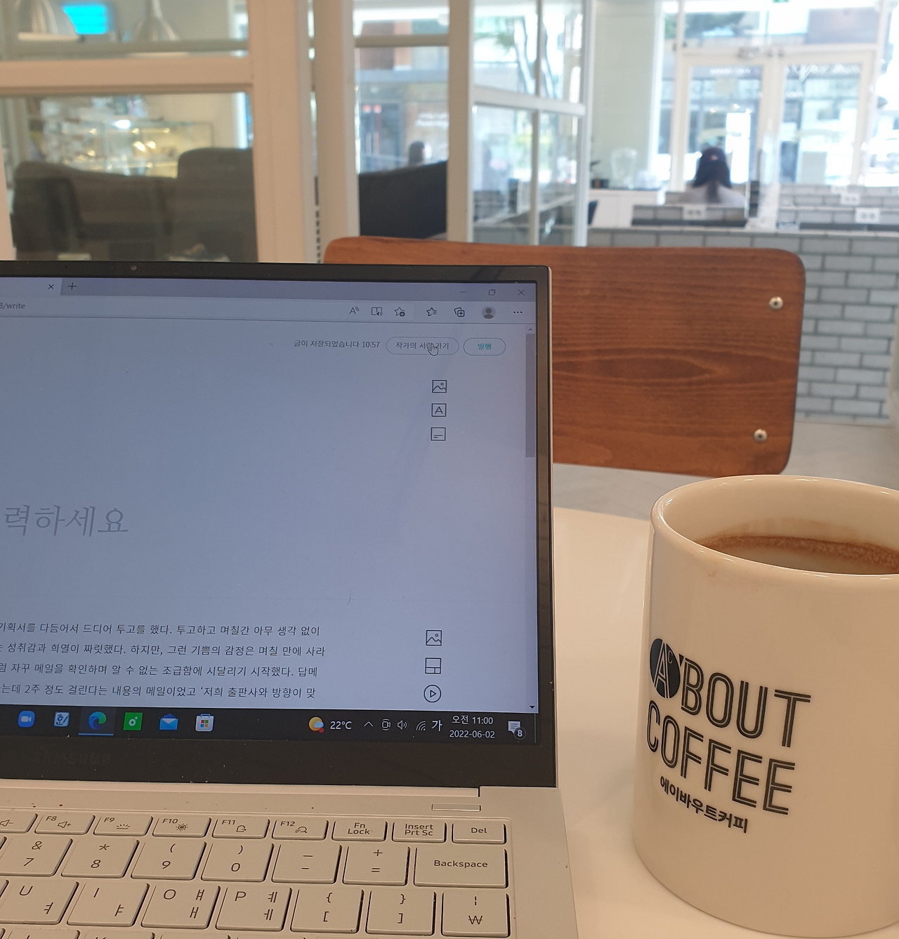 아무튼 난 뭔가를 하나 새롭게 해 냈고, 토할 것 같이 쓰는 ‘토고’를 마치고 당분간 뭔가를 쓰는 건 안 하고 싶었지만 일주일 만에 다시 자연스럽게 쓰기의 세계로 돌아왔다. 주로 아이를 픽업하거나 장을 보는 곳에 위치한 이곳에서 한가로이 글을 쓰니 이보다 더 좋을 순 없다~.