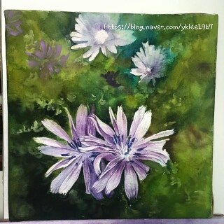꽃이 예쁜 채소들을 골라서 심어봐야겠다. 누군가 정성스럽게 가꾸는 밭에 예쁜 꽃들이 많이 핀 걸 보고 한참이나 이리저리 사진을 찍어 와 치커리 꽃을 그렸다. 꽃이라 칭하지 않는 것이 억울하겠다. 꽃도 보고 건강도 챙기고 일석이조를 누리려면 몸을 바지런히 놀려야 하는데 아직 생각만 바지런한 나다. 먹지 않아도 꽃이 이리 예쁜데 화단가꾸기로도 금상첨화인 치커리꽃이다.