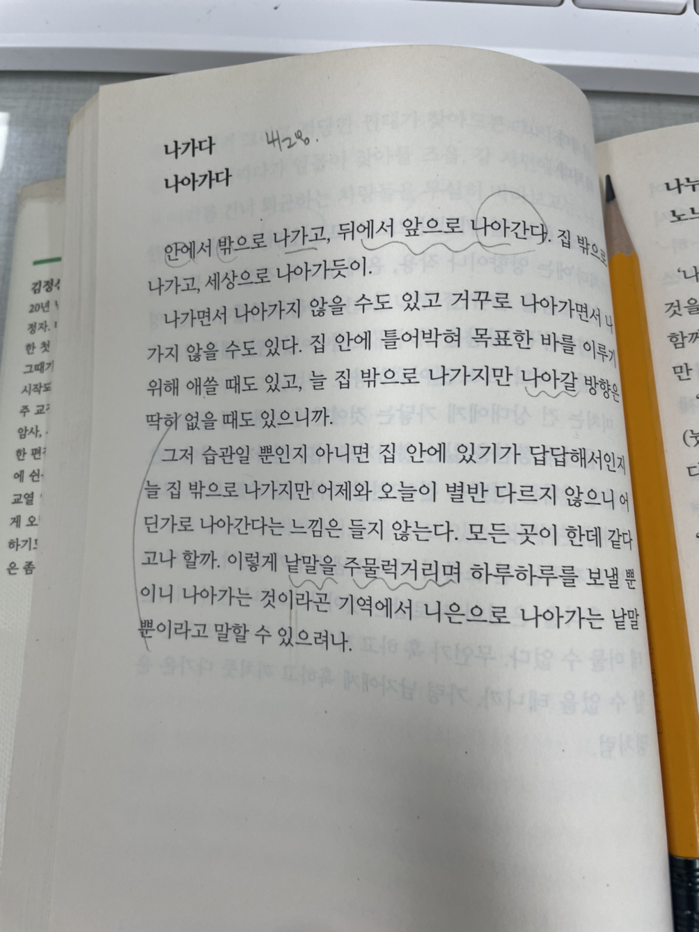 “그저 습관일 뿐인지 아니면 집 안에 있기가 답답해서인지 늘 집 밖으로 나가지만 어제와 오늘이 별반 다르지 않으니 어딘가로 나아간다는 느낌은 들지 않는다. 모든 것이 한데 같다고나 할까. 이렇게 낱말을 주물럭거리며 하루하루를 보낼 뿐이니 나아가는 것이라곤 기역에서 니은으로 나아가는 낱말 뿐이라고 말할 수 있으려나.”_ 김정선, 《동사의 맛》, 유유출판