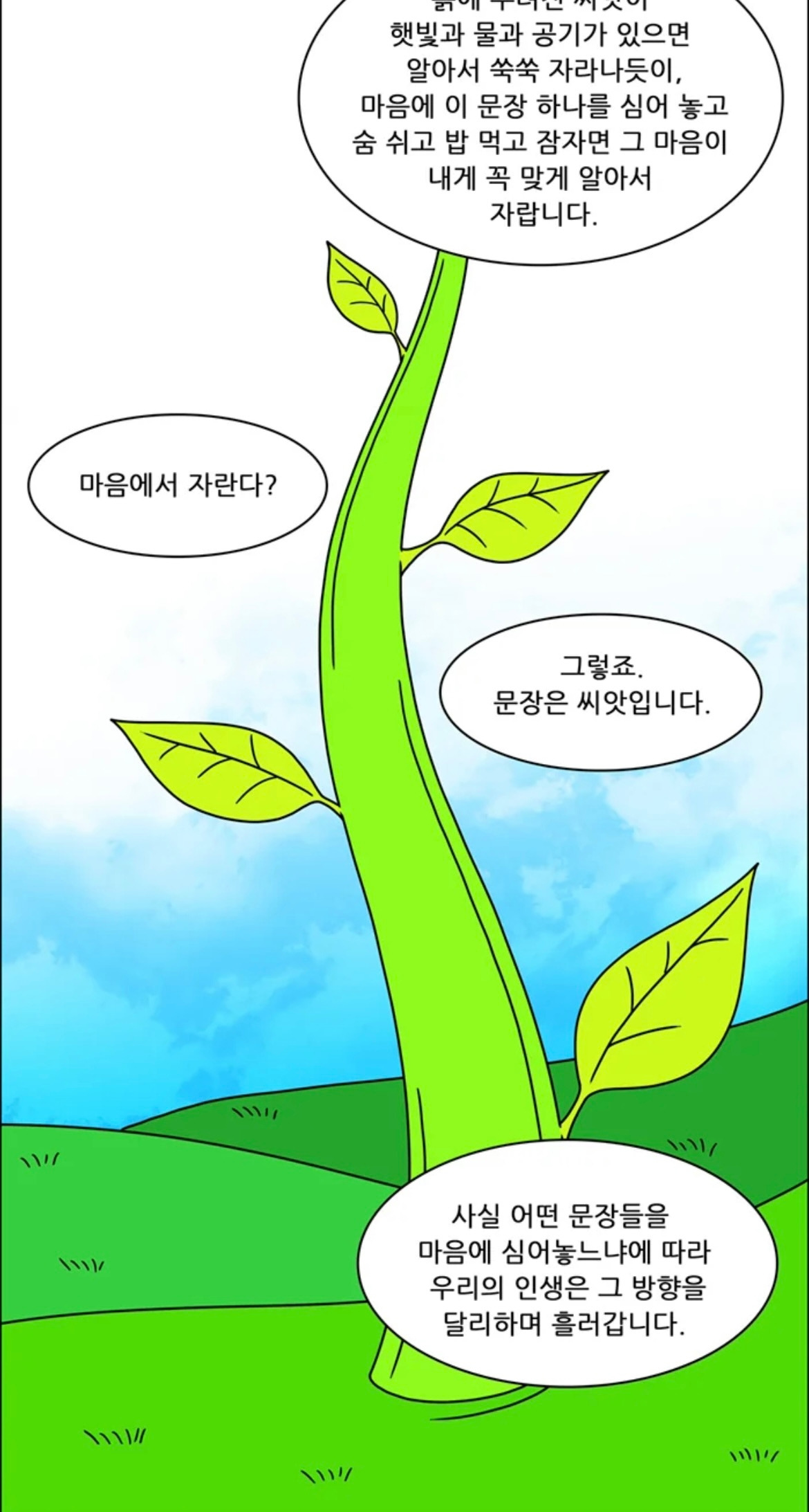 “그렇죠. 문장은 씨앗입니다. 사실 어떤 문장들을 마음에 심어 놓느냐에 따라 우리의 인생은 그 방향을 달리하며 흘러갑니다.”