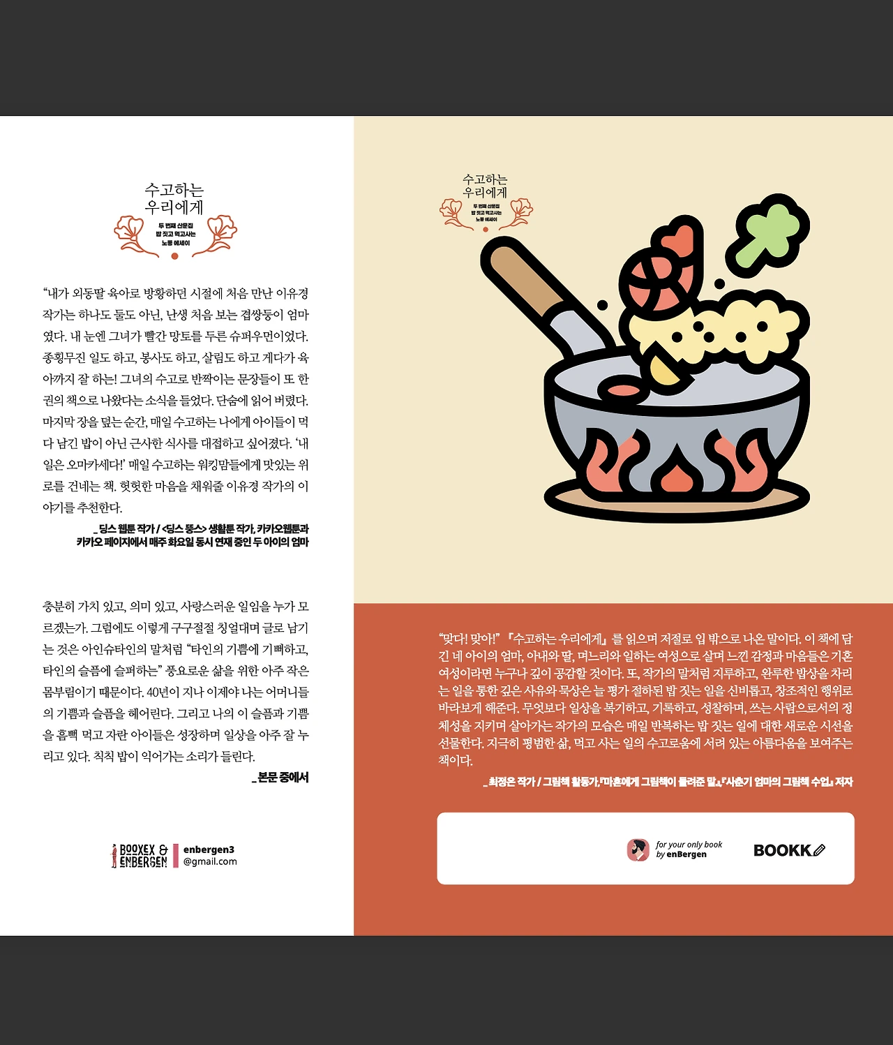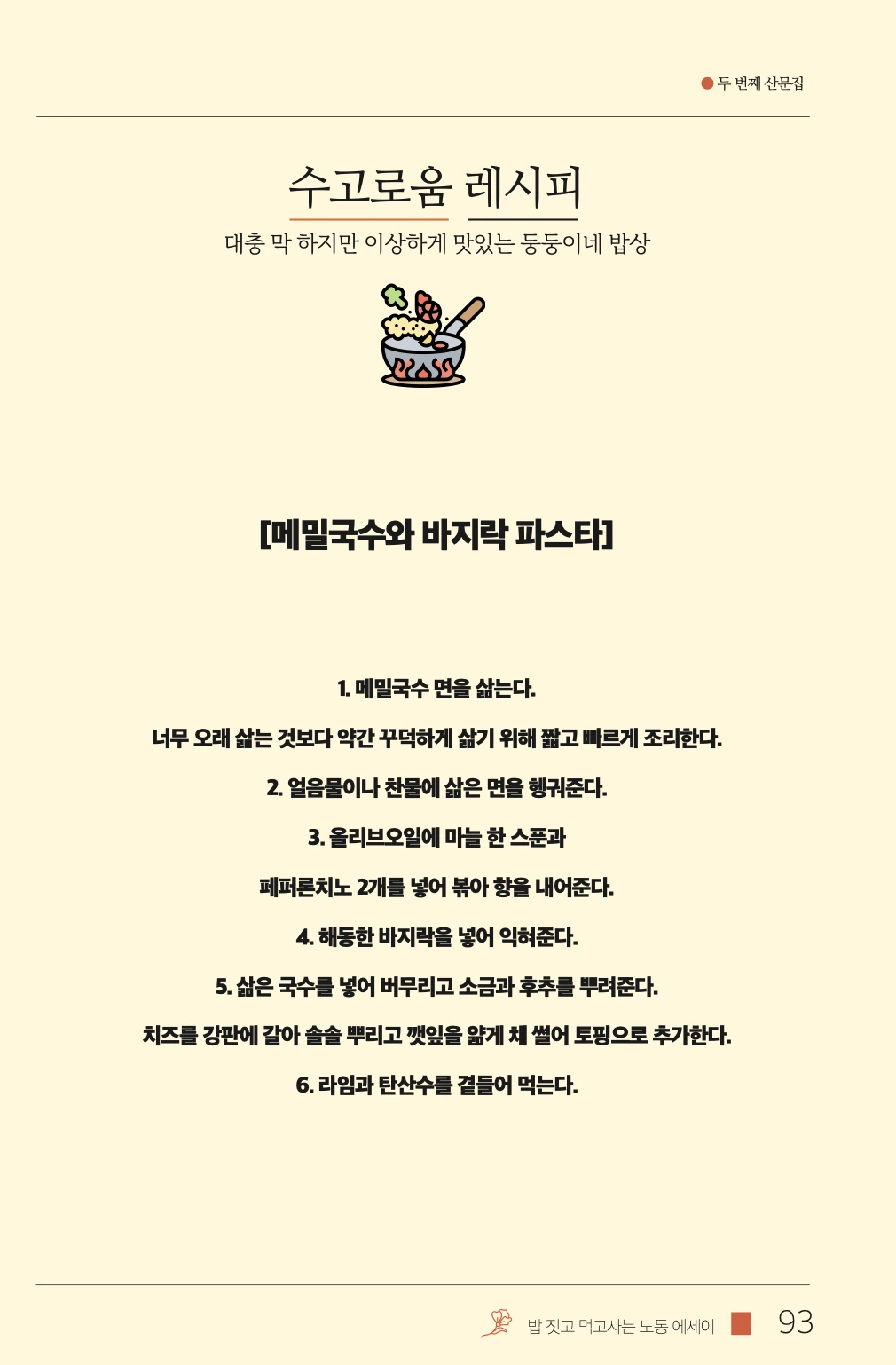 육아와 집안일, 밥과 감정, 철학과 유머까지 냄비 뚜껑을 열며 쓴 작가의 진짜 삶의 기록. 짜장 떡볶이, 고소한 쌈장, 토마토 브루스케타, 메밀 국수 파스타, 친정 엄마 밥상까지— 읽다 보면 군침 돌고, 울컥하고, 낄낄 웃게 되는 이야기들.