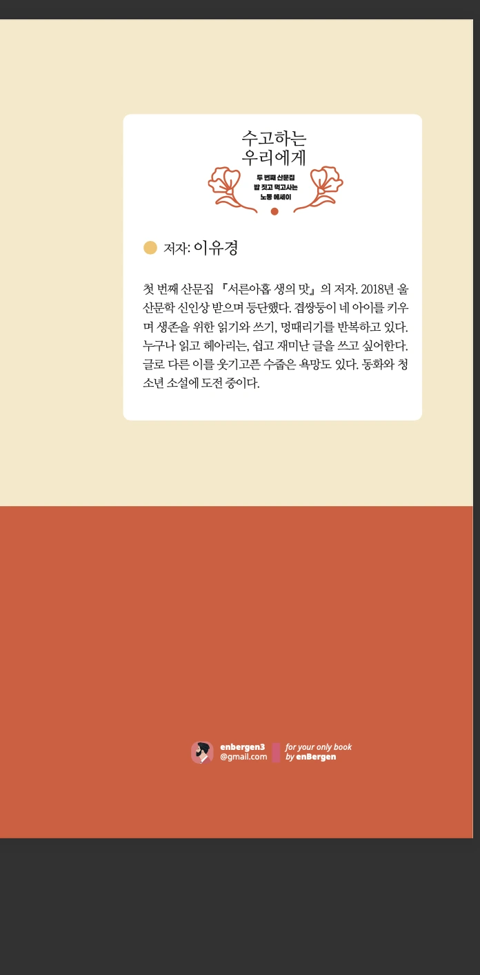<수고하는 우리에게>는 새 옷을 입고 <수고로움> 개정판으로 탄생했습니다. 글씨 크기도 키우고, 더 따뜻하고 넉넉하게 만들었어요. 멋지게 디자인 맡아준 엔베르겐 팀께 감사드립니다. 이전 책을 구매하신 분들께 죄송하고 감사한 마음이고, 늘 제 글을 응원하고 기다려준 독자분들께도 깊은 감사의 마음 전합니다.