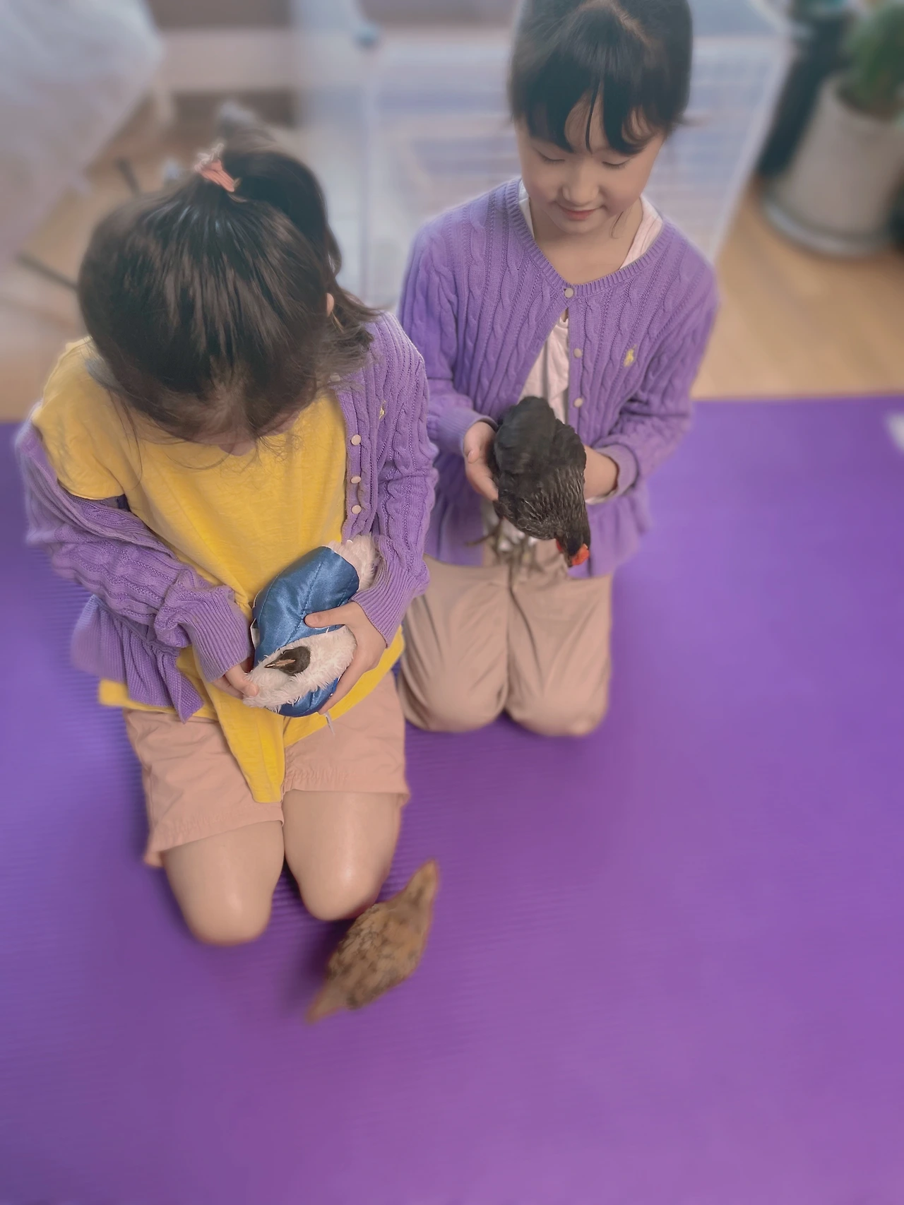 아들들의 오랜 친구 집을 방문하였다. 친구 집은 이미 동물농장이 되어있었다. 합방을 기다리는 가재들, 물고기, 병아리 몇 마리와 닭이 된 롯. 급격한 속도로 생육하고 번성하는 데 소명을 다하고 있는 집이었다. 롯은 수탉의 이름이다. (롯데리아의 롯이라는데? 이유를 묻지 못했다.) 여하튼 농장에서 얻어온 청계 유정란이 21일 만에 부화하여 건강하게 자란 것이다. 아파트에서 닭 사육이라니. 심지어 롯은 본인이 닭이라는 것을 인식하지 못하고, 사람들의 손길을 구하고, 얌전히 걷고, 쓰다듬어주면 잠들고, 주인에게 와서 자신을 예뻐해 달라고 한다. 애완견 혹은 애완묘 못지않은 사랑을 주고받고 있던 애완계. 딸들은 병아리와 닭을 꼭 품고 집에 가지 않겠다고 하는데 내가 이토록 생소한 이유는 닭을 ‘치킨’으로만 만나왔기 때문이리라.