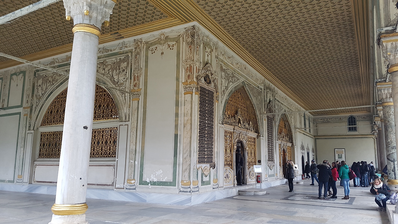 궁전 내부로 더 들어가면 왕족들의 사생활 공간으로 사용했던 건물 Arz Odasi이 나온다. 그 중에서 모자이크 타일로 화려함을 뽐내는 건물이 나타난다. 복원해 놓은 붉은 색 벨벳 의자에 앉으면 왕족이 된 것 같은 분위기이다. 왕족들만을 위한 작은 정원과 전망 누각이 아직도 화려하게 관리되고 있다. 이 건물 주변에서 바라다보는 해엽 건너 편으로 이스탄불에 들어오고 나가는 배들이 한눈에 들어온다. 그리고 그 건너편이 지리학적으로 아시아 땅이 시작되는 곳이다.