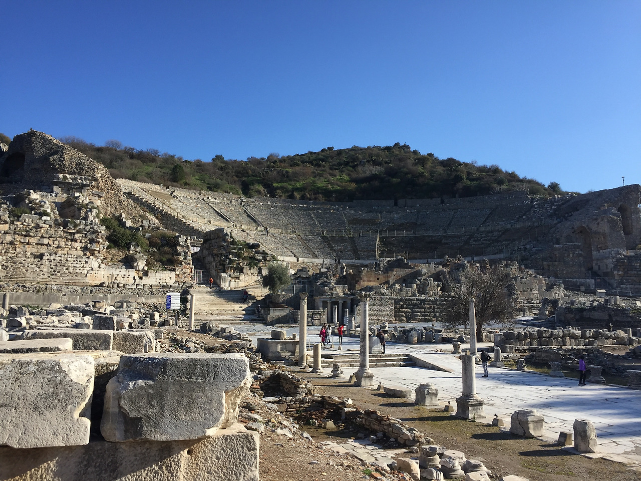 입구를 통과하면 원형극장이 왼쪽에 나타난다. 지금으로부터 2천여 년 전에 만들어졌다고 한다. 지난번 그리스 에피다우로스 원형극장에서 느꼈던 너무나 황홀했던 기억을 되살리며 극장 무대 가운데에 서 본다. 에페소스 원형극장이 에피다우로스 원형극장보다 조금 더 큰 규모로 보인다. 전체적으로 분위기는 비슷하지만 분명 소리가 다르다. 에페소스는 일반 대극장이라면 에피다우로스 원형극장은 음악 전용 극장 같다고 해야 할까.