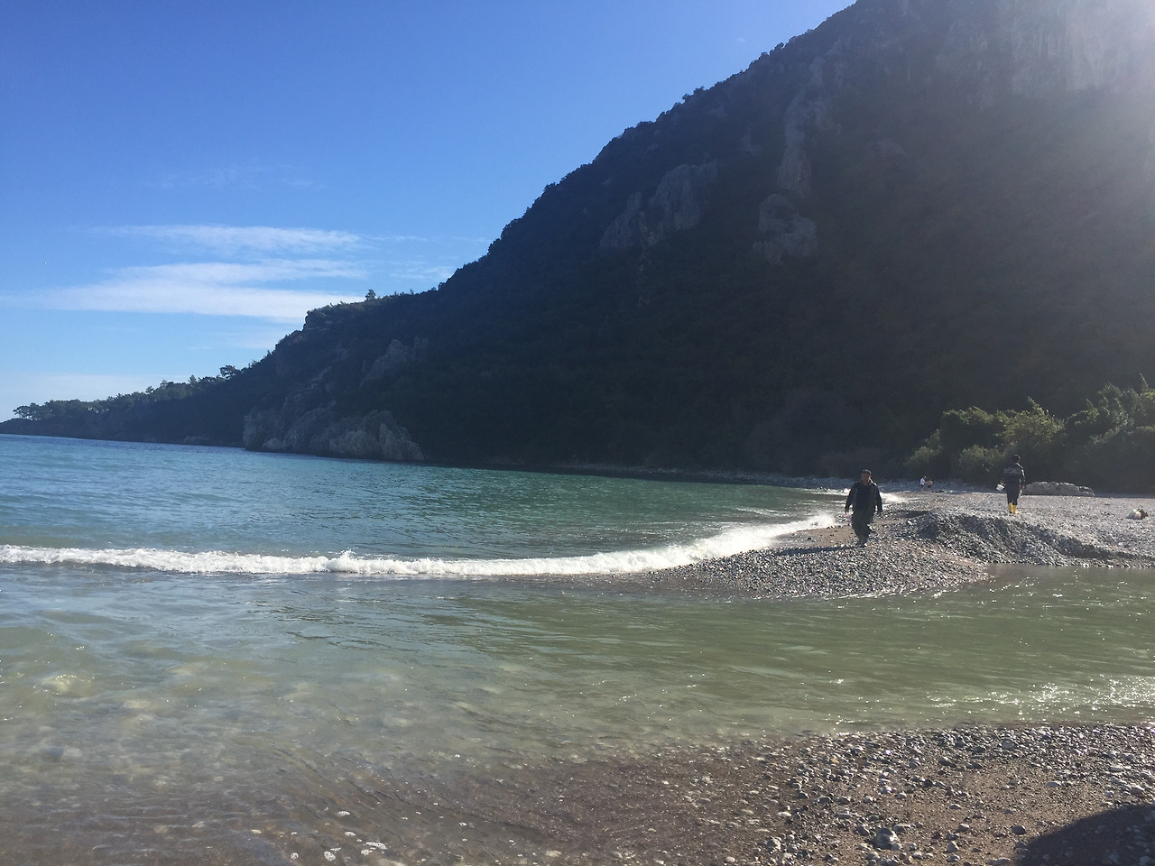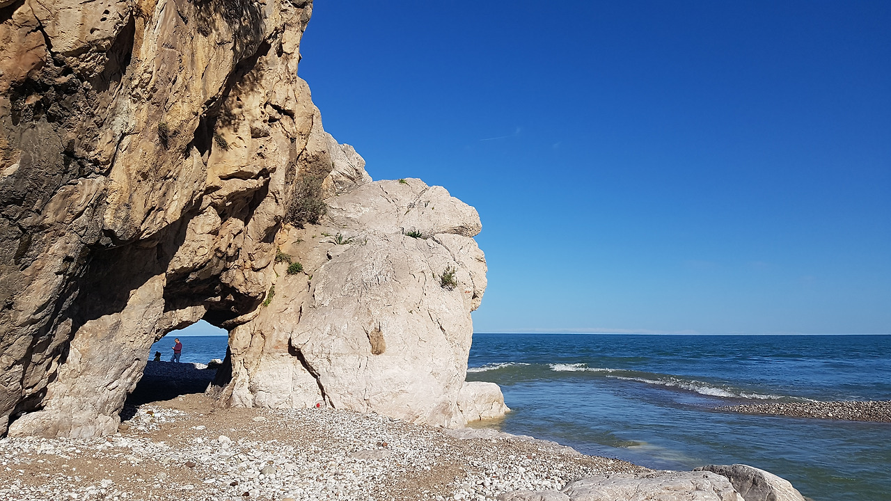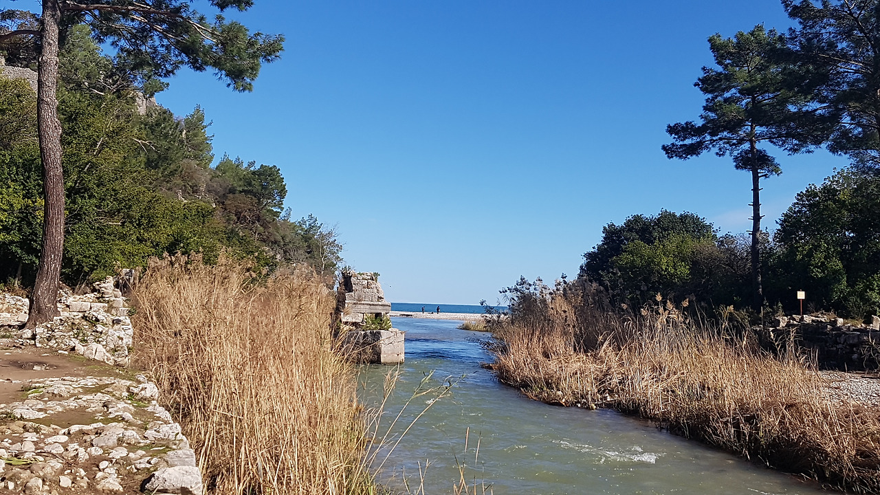 강물이 만나는 곳은 안탈리아 해안이다. 강물이 바닷물 속으로 섞여져 들어간다. 그리고 그 옆으로 몇몇의 사람들이 낚시를 즐기고 있다. 푸른 하늘과 어울리게 바다물도 푸르다. 넓은 모래사장이 펼쳐저 있어서 날씨가 따뜻할 때에는 해수욕을 즐기러 많은 사람들이 올 것 같은 곳이다. 유적지와 해안을 드나들 수 있도록 바위 동굴을 파 놓은게 귀엽기도 하다.