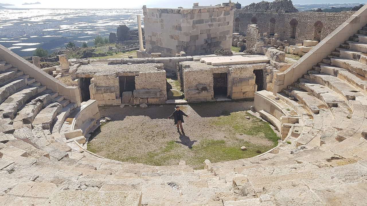 신전 앞에 해안선을 바라다 볼 수 있는 경사진 비탈면을 따라 작은 원형극장이 있다. 규모가 매우 크지는 않지만 원형에 가깝도록 복원이 마무리 된 듯 하다. 많은 곳에 새로이 끼운 하얀 대리석이 눈에 뜨인다. 객석에 앉아 있으면 저 멀리 해안선이 한 눈에 들어온다. 아내가 그 원형 극장에서 또 한번 작은 음악회를 연다. 그리스에서 부터 터키까지 만나는 원형극장마다 작은 음악회를 여는 아내다. 아무도 찾지 않는 이 작은 음악당. 2,800년 전에 이곳에서 살았던 사람들이 아내의 노래에 박수를 보내는 것 같은 분위기 처럼 아내가 열창을 한다.