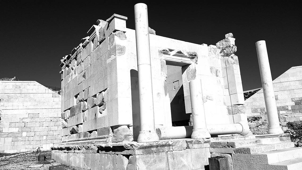 그 원형 극장 무대 뒤에는 작지만 균형이 잘 잡힌 신전이 자리하고 있다. 이 신전도 상당 부분 복원작업을 마친 것으로 보인다. 이 신전에는 어떤 신을 모셨을까가 궁금해지지만 그와 관련된 어떠한 정보도 알 수 없다. 사실 구글에서 검색해 보면 이 도시의 유래에 대해서는 어느 정도 설명이 되어 있지만 각각의 유적물에 대해서는 충분한 설명이 나와 있지 않다.