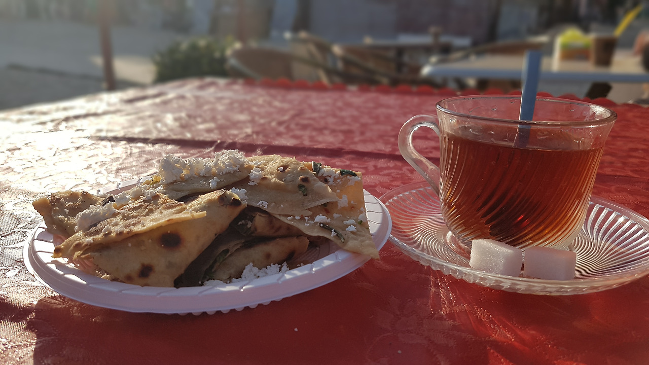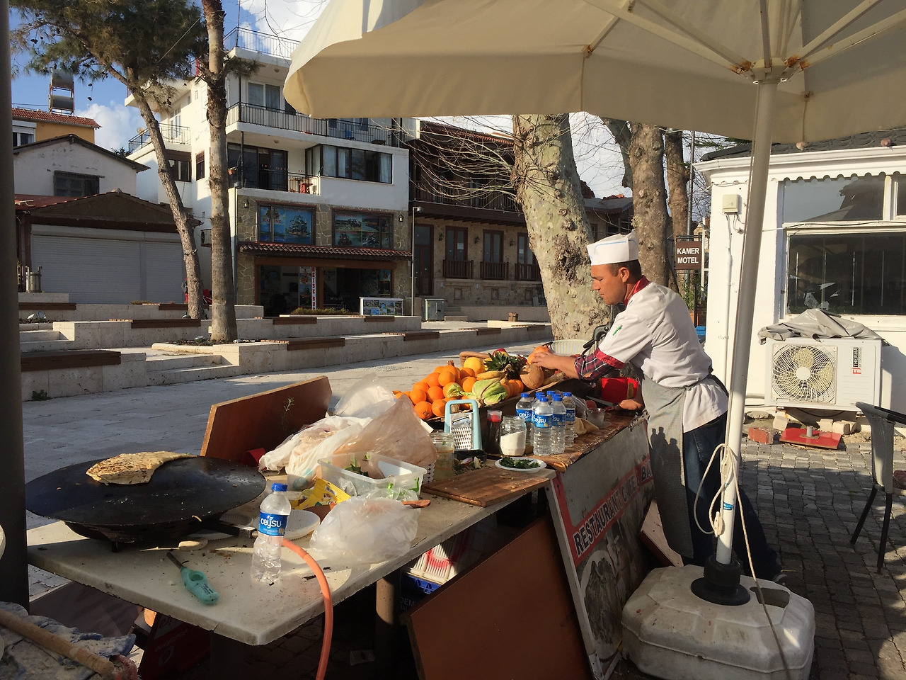 다시 해안가 길로 나오니 아까 지나가다 보았던 노점상이 간식거리를 팔고 있다. 그분 호객 행위가 수준이 높다. 우리도 그분의 호객에 이끌려 안쪽 의자에 앉아서 간단한 요깃거리를 먹었다. 차를 4리라(9백 원 정도, 안탈리아에서는 2-3리라 정도면 마실 수 있었다.)에 파는 것으로 보아 이곳도 다른 곳보다 조금씩 비싼 물가가가 적용되는 곳인가 보다.